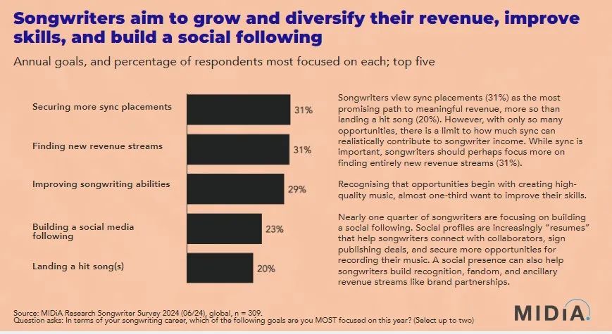 《报告》显示,只有29%的创作者将提升创作能力作为年度目标,而将创作热门歌曲作为年度目标的创作者仅占20%。对比来看,反而获得更多的作品同步许可、寻找新的收入来源这两项目标占分别31%,建立社交媒体上的粉丝群体占23%。
