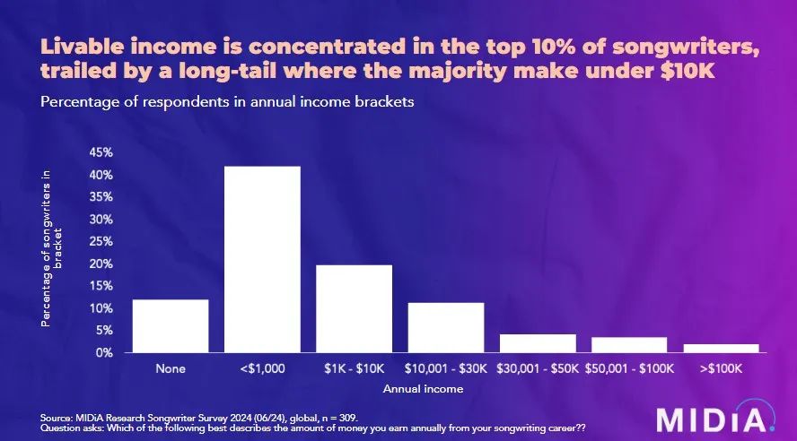 《报告》也显示,约40%的词曲人年收入不足1000美元,约20%的词曲人年收入在1000美金到10000美金之间,仅10%的创作者年收入在10000至30000美元之间。