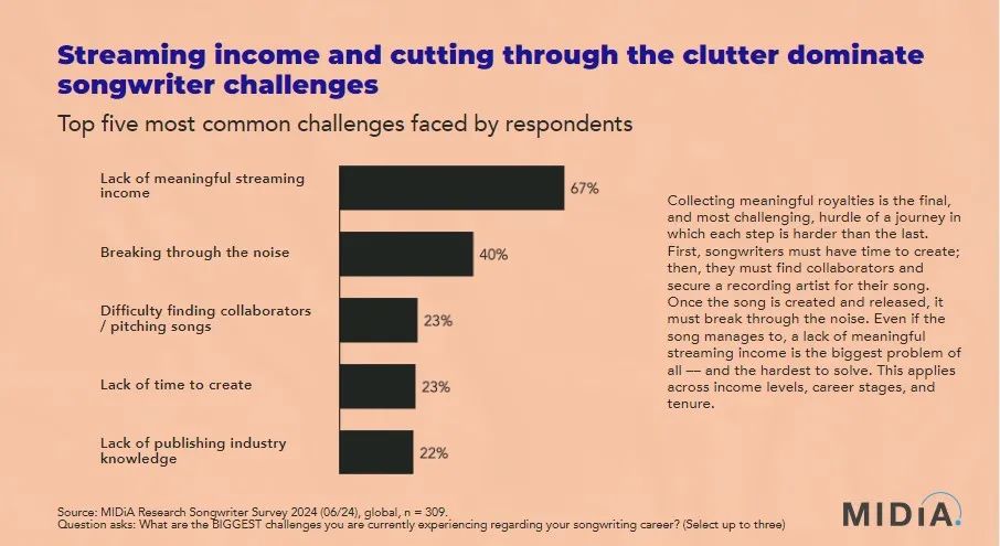 《报告》显示,67%的受访者表示流媒体收入不足以解决基本生活需求,40%的人担心自己的作品会被淹没。23%的创作者难以找到合作方、没有充分时间进行创作,22%的人缺乏版权知识。