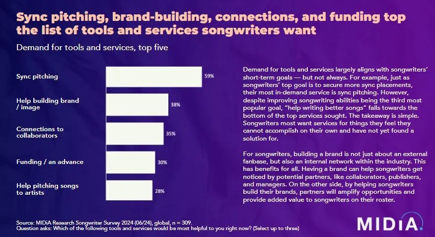 据MIDiA统计,59%的创作者希望将作品推销给影视、广告、视频游戏等媒体,以获得同步权收益;38%的创作者希望建立自己的品牌,提升他们在行业内的知名度和影响力;35%的创作者表示需要更多的合作机会和人脉网络;30%的创作者表达了对资金支持的需求,28%的创作者表示需要将他们的作品推荐给更知名的艺人。