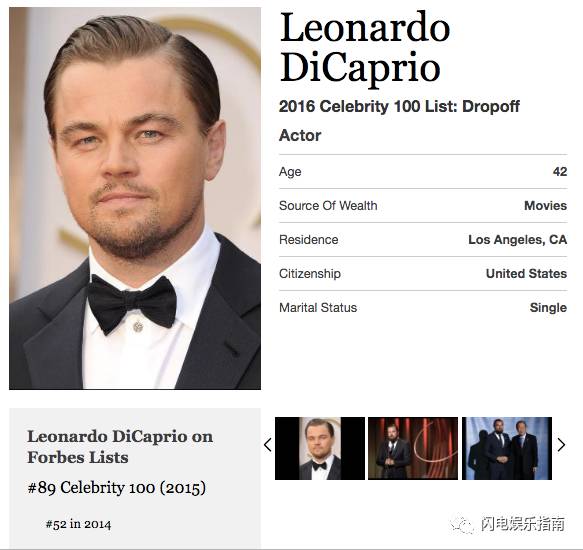 根据福布斯报道,2015年,迪卡普里奥年收入2900万美元,居福布斯全球名人榜排名第89位;2016年,他则跌出了前100,榜上无名。