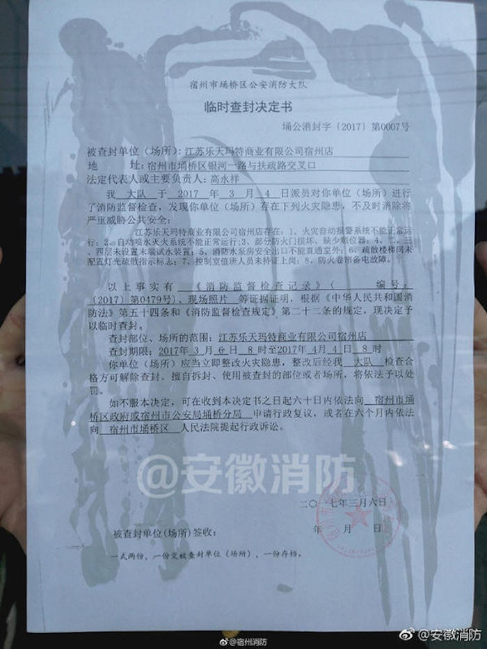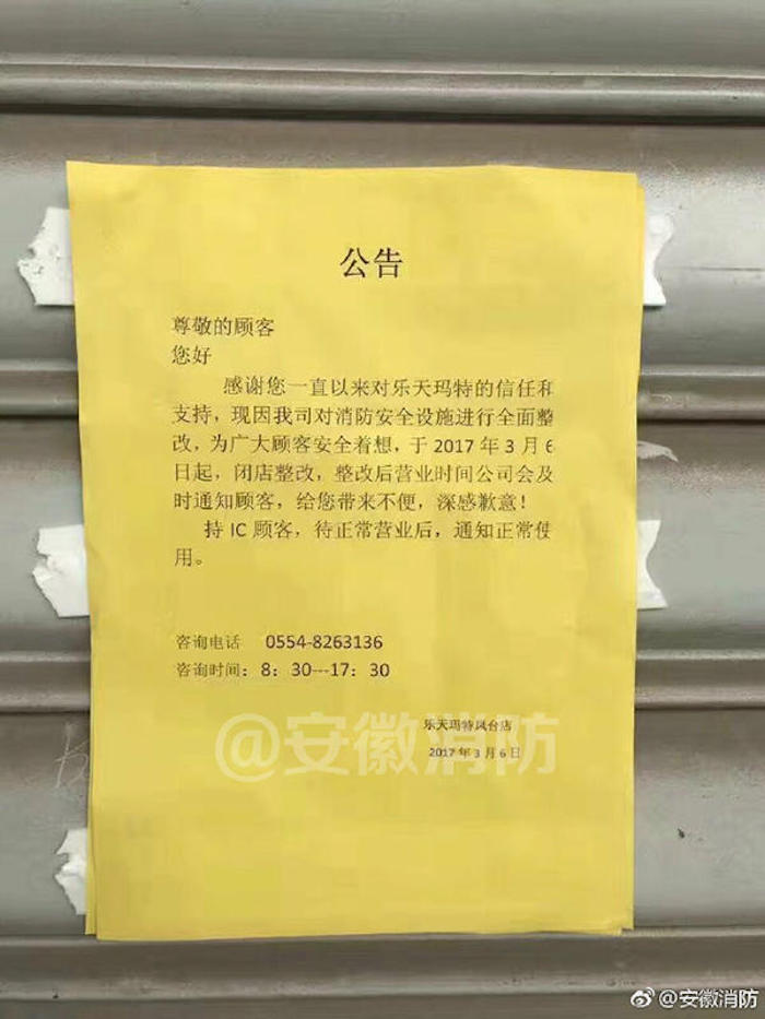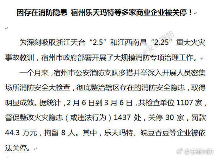 界面记者查阅安徽消防微博主页,已无法找到上述微博。但腾讯新闻此前报道中的资料显示,为深刻吸取浙江天台“2.5”和江西南昌“2.25”重大火灾事故教训,宿州和淮南展开了大规模消防专项治理工作,两地的乐天玛特因此被临时查封。