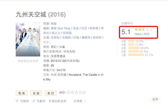 《九州天空城》是樊斐斐和杨磊这对夫妻档的一部网台联动的周播剧作品。出品方是寰亚和企鹅影视,张若昀、关晓彤、鞠婧祎、刘畅、陈若轩、朱圣祎、张鲁一、刘敏等联袂主演。这部剧开拍之初的动静很大,腾讯视频和企鹅影视都将其视为原创IP的扛鼎之作——但出乎所有人的意料,以正剧知名的导演杨磊,竟然拍出来一部以“妖艳贱货”引爆社交网络的奇幻吐槽剧。豆瓣5.1的打分,虽然不一定能够代表这部剧的品质,但评论人数只有7000多人却代表着这部剧的热度并不如官宣那么火爆吧。