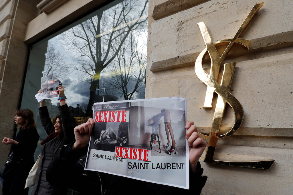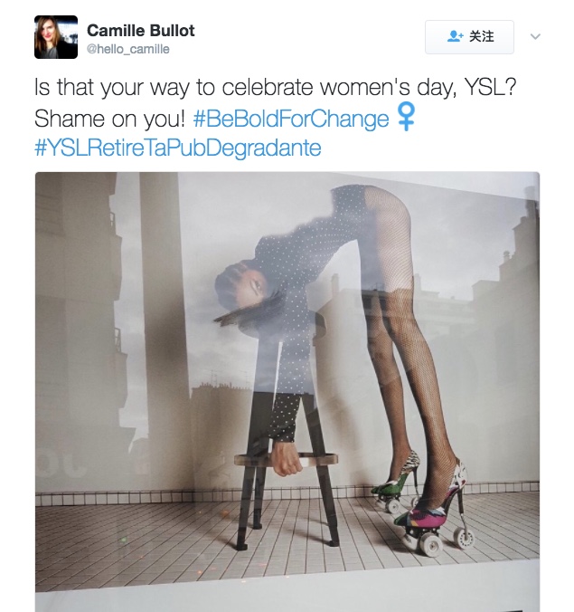 在推特上,法国网民发起了#YSLRetireTaPubDegradante#(YSL,撤掉你的丢人广告)的线上抗议活动,甚至有人发文质问该品牌的首席执行官Francesca Bellettini(业内少数的几位女性高管之一)会否以同样的造型拍一组广告;法国女权团体Oséz le Feminisme!斥责Saint Laurent 并非初犯,要求当局立即撤掉不雅广告,其发言人Raphaëlle Rémy-Leleu在周一表示:“他们觉得这个时代,哪个女人会对这样的广告买账?”