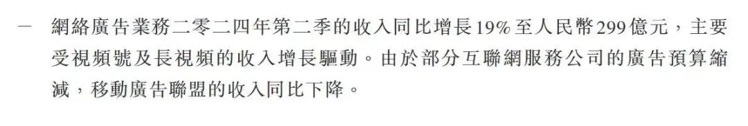 同期,腾讯的网络广告收入为299亿元,同比增长19%,但增幅是过去一年中的最低值。腾讯称,增长主要来自视频号及长视频业务,“由于部分互联网服务公司的广告预算缩减,移动广告联盟的收入同比下降”。