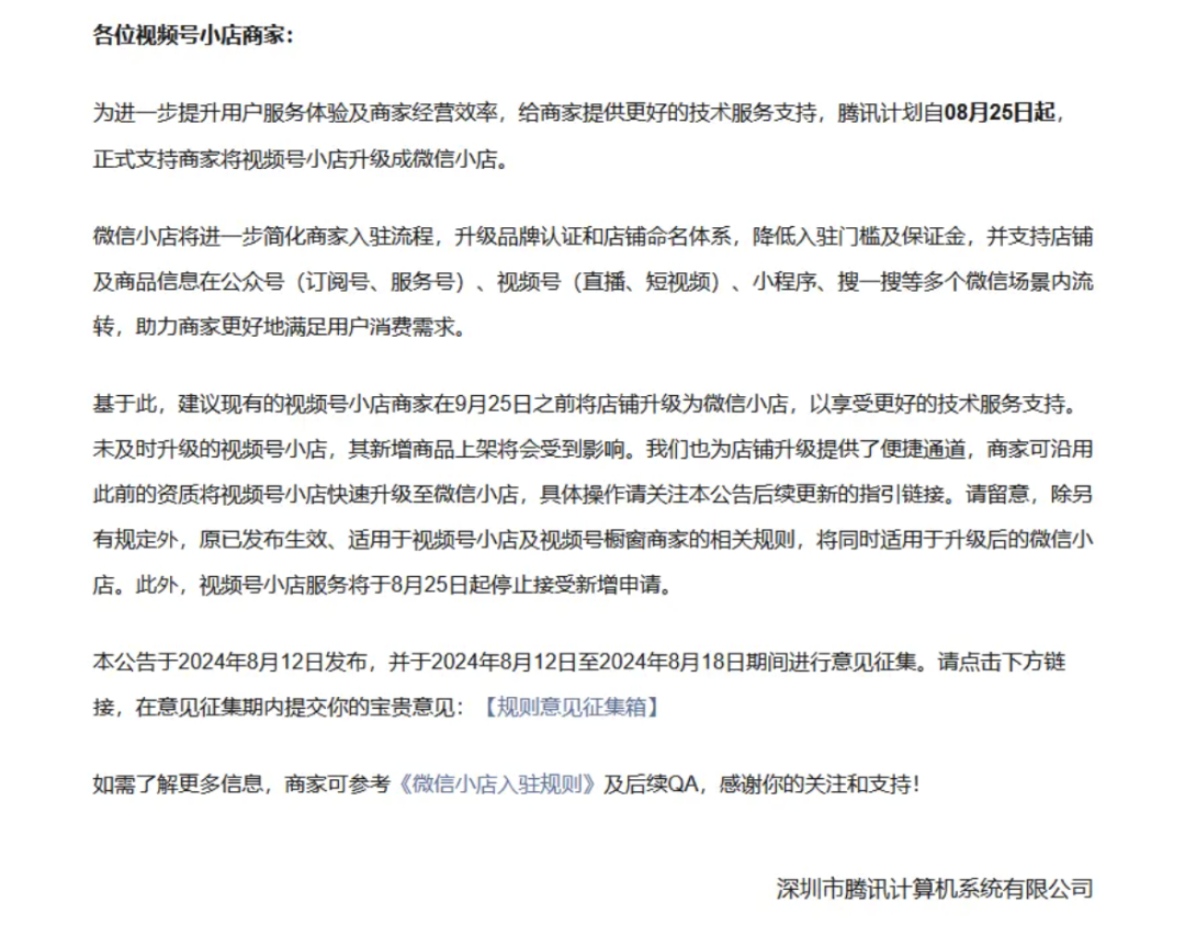 不仅如此,今年8月12日,腾讯面向视频号小店商家发布通知,自8月25日起,正式支持商家将视频号小店升级成微信小店,并进一步简化入驻流程、升级品牌认证和店铺命名体系,最重要的一点是“支持店铺及商品信息在公众号(订阅号、服务号)、视频号(直播、短视频)、小程序、搜一搜等多个微信场景内流转”。