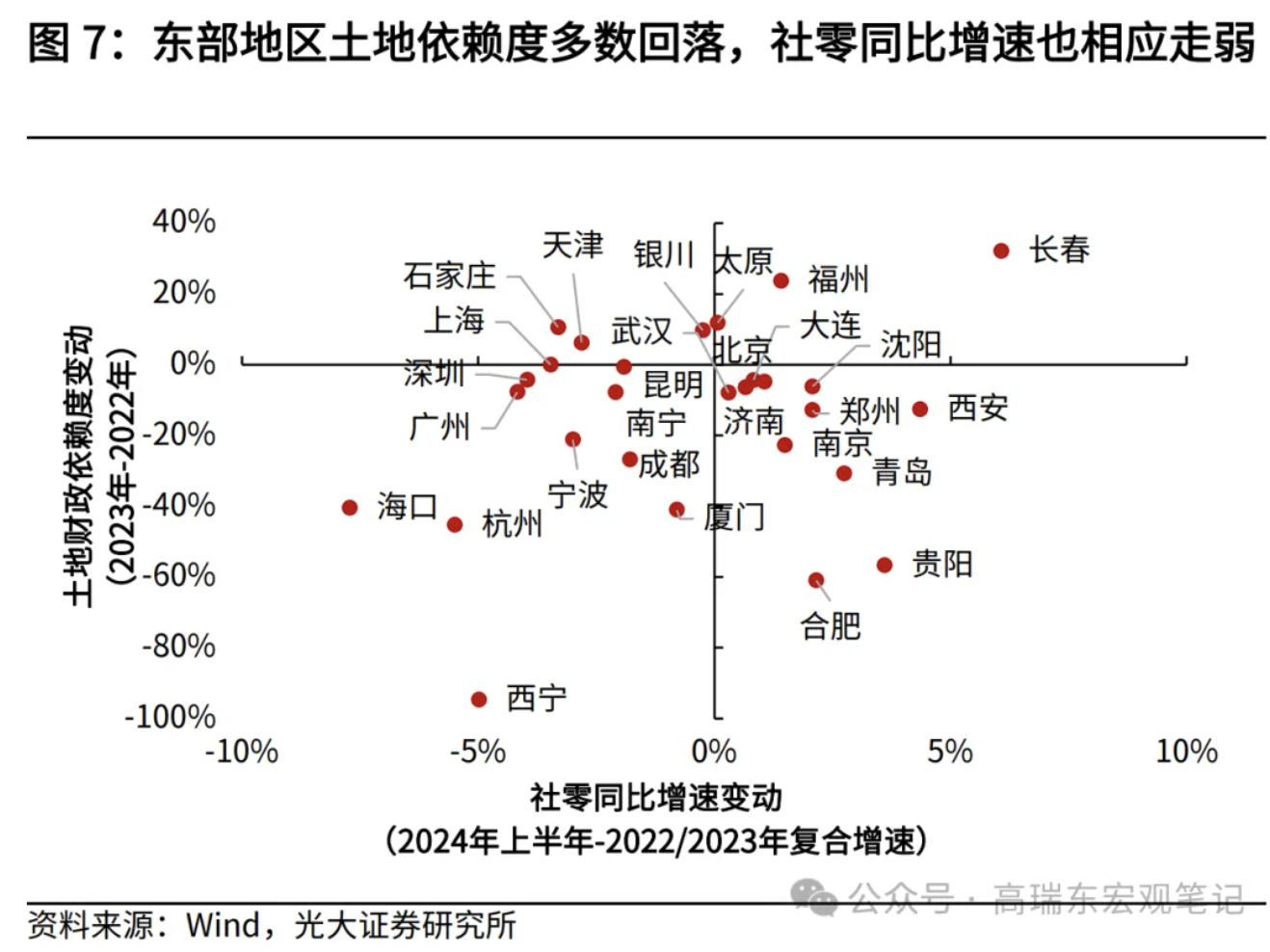 我们以政府性基金收入/公共财政收入作为土地依赖度的近似指标,可以发现二线城市中,土地财政依赖度降幅较大的地区,多数呈现消费疲弱特征。例如,海口、杭州、厦门、宁波、南京、西宁、成都、贵阳等地,2023年土地财政依赖度相较上年分别减少20个百分点以上,主要集中在东部地区和西部地区。