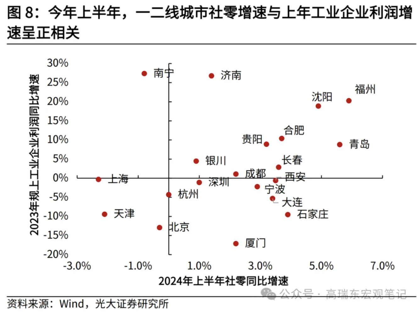 例如,今年上半年社零同比增速高于或持平于全国均值的福州、青岛、沈阳、合肥等地,2023年规模以上工业企业利润同比增速分别为20%、9%、19%、10%。而一线城市和杭州、宁波、天津等东部发达城市,2023年工业企业利润同比增速多数为负,与其产业结构高度化不足,对实体经济支撑不足有关。
