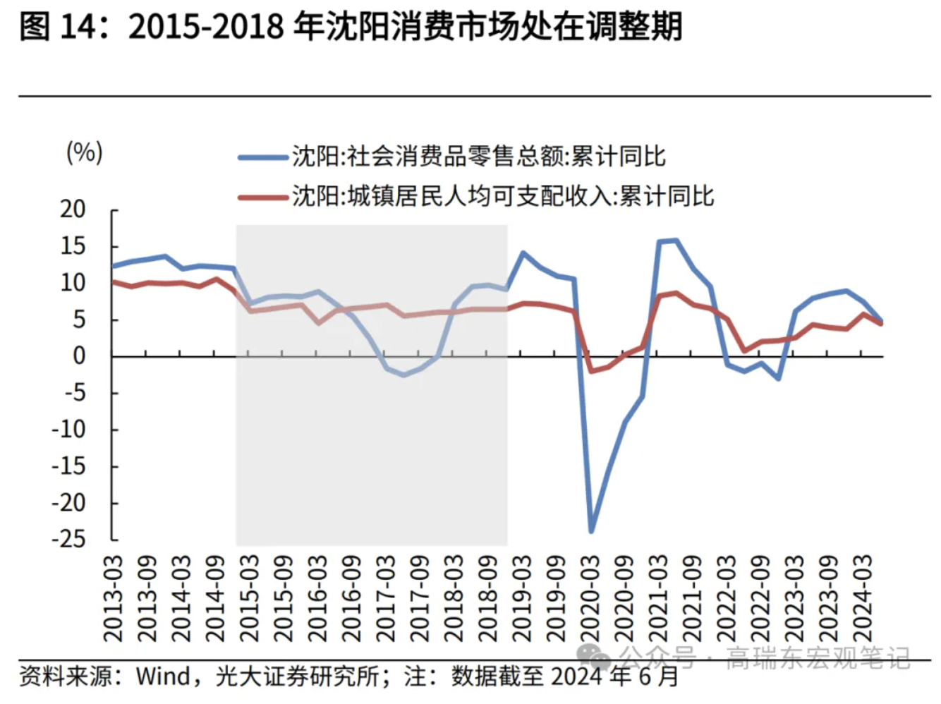 因此当前一二线发达地区消费走弱,源于经济发展模式的深度调整。如果参考东北地区早期去地产化的经验,消费恢复常态大概需要四年左右的时间。2014年-2015年,沈阳房地产市场加速调整,此后缓慢恢复。社零同比增速自2015年持续走弱,于2017年年中触底,此后缓慢恢复,直至2018年末社零同比增速大体企稳。考虑当前房地产市场仍未企稳,消费市场恢复可能需要更长时间。