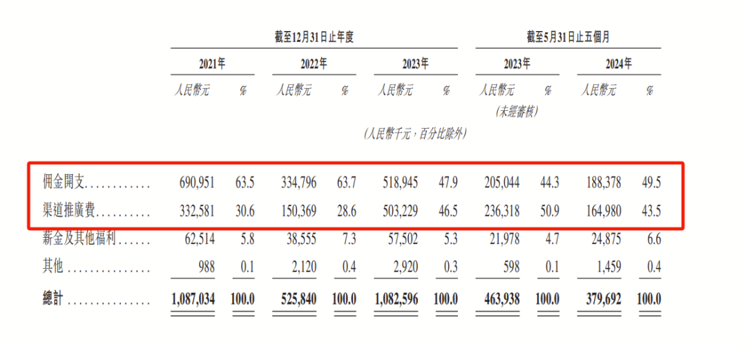 在这之中,佣金支出占据了营业成本的大头,流向了保险代理人和持牌保险经纪代理公司,2021年,公司的佣金支出占同期营业成本的比例为63.6%,到了2024年前5个月则下降至49.5%。