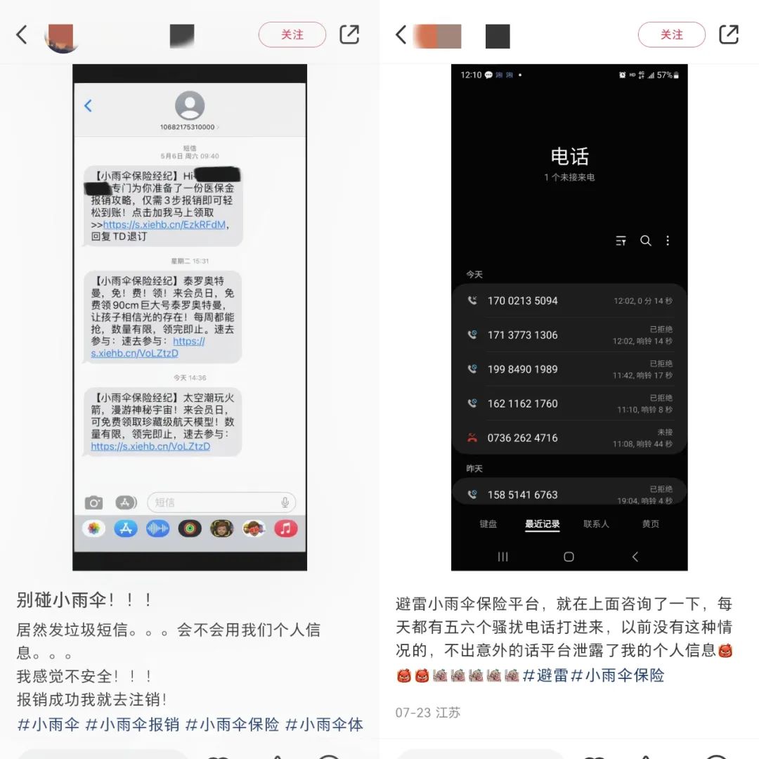 在引流方式上,手回科技的部分业务员选择通过电话营销的方式接触潜在客户。然而,这种策略似乎并未得到所有用户的欢迎。在小红书平台上,有网友反映收到了小雨伞的垃圾短信,还有网友称,在小雨伞APP上简单咨询后,便不断接到五六个骚扰电话。