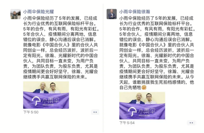 更令人意外的是,同日下午几乎同一时间,徐瀚和光耀在微信朋友圈宣布误会已经消除,且两人发布的内容大致相同。徐瀚发文称,疫情期间分离两地,信息错位的误会,静心沟通后误会已消解。