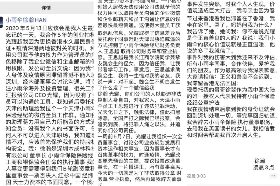 然而,在公司蓬勃发展的时期,创始团队却出现了裂痕。2020年5月14日凌晨3点,徐瀚在微信朋友圈公开指责CEO光耀夺权,声称在自己滞留香港期间,光耀移除自己在公司内部的相关权限,以及指出光耀占据公司财务章和营业执照。