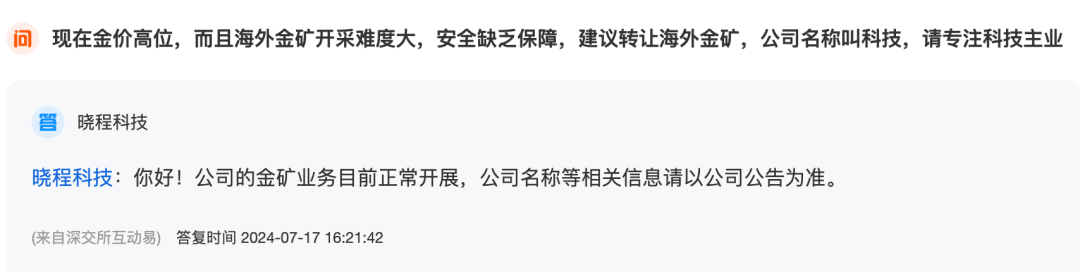 也有投资者对公司的发展策略产生疑虑,甚至有投资者质疑海外金矿开采难度大,安全缺乏保障,建议晓程科技转让海外金矿,该投资者还在互通平台提出“公司名称叫科技,请专注科技主业”。