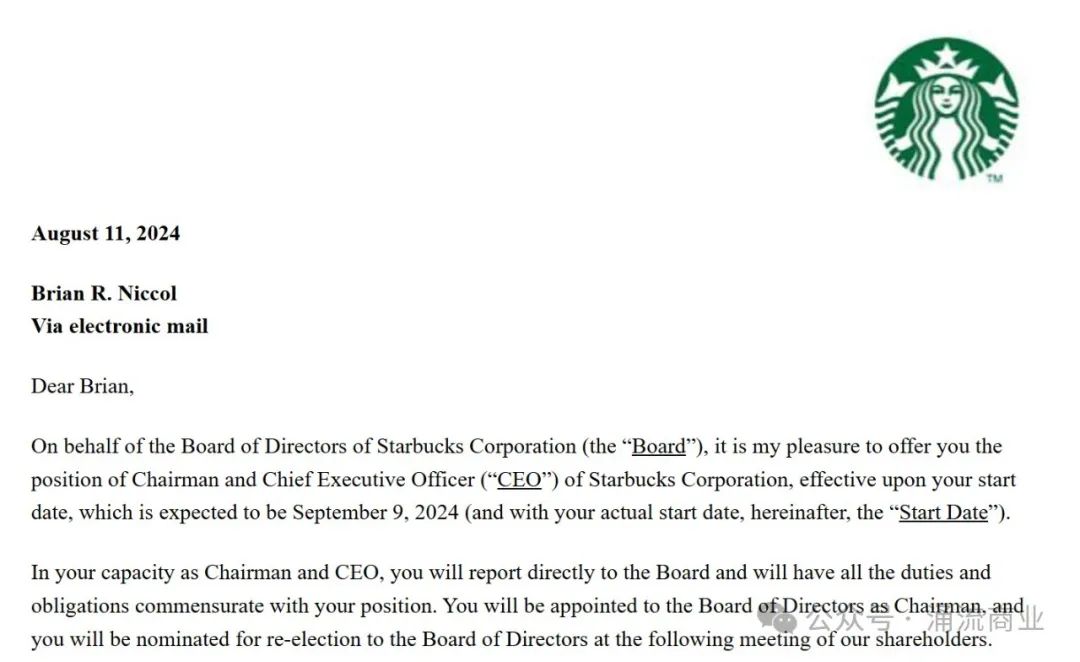 Niccol和星巴克的合约签署于2024年8月11日,文件显示,Niccol将首先获得1000万美元的签约奖金、7500万美元的股权赠予。这些股权用以补偿他在原公司Chipotle未获得的奖金和股票。