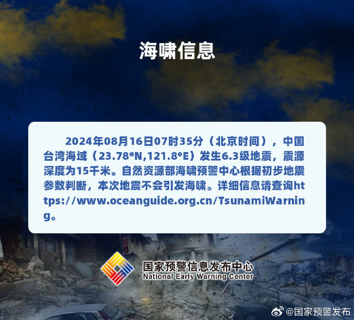 @国家预警发布 消息,8月16日07时35分(北京时间),中国台湾海域(23.78°N,121.8°E)发生6.3级地震,震源深度为15千米。自然资源部海啸预警中心根据初步地震参数判断,本次地震不会引发海啸。