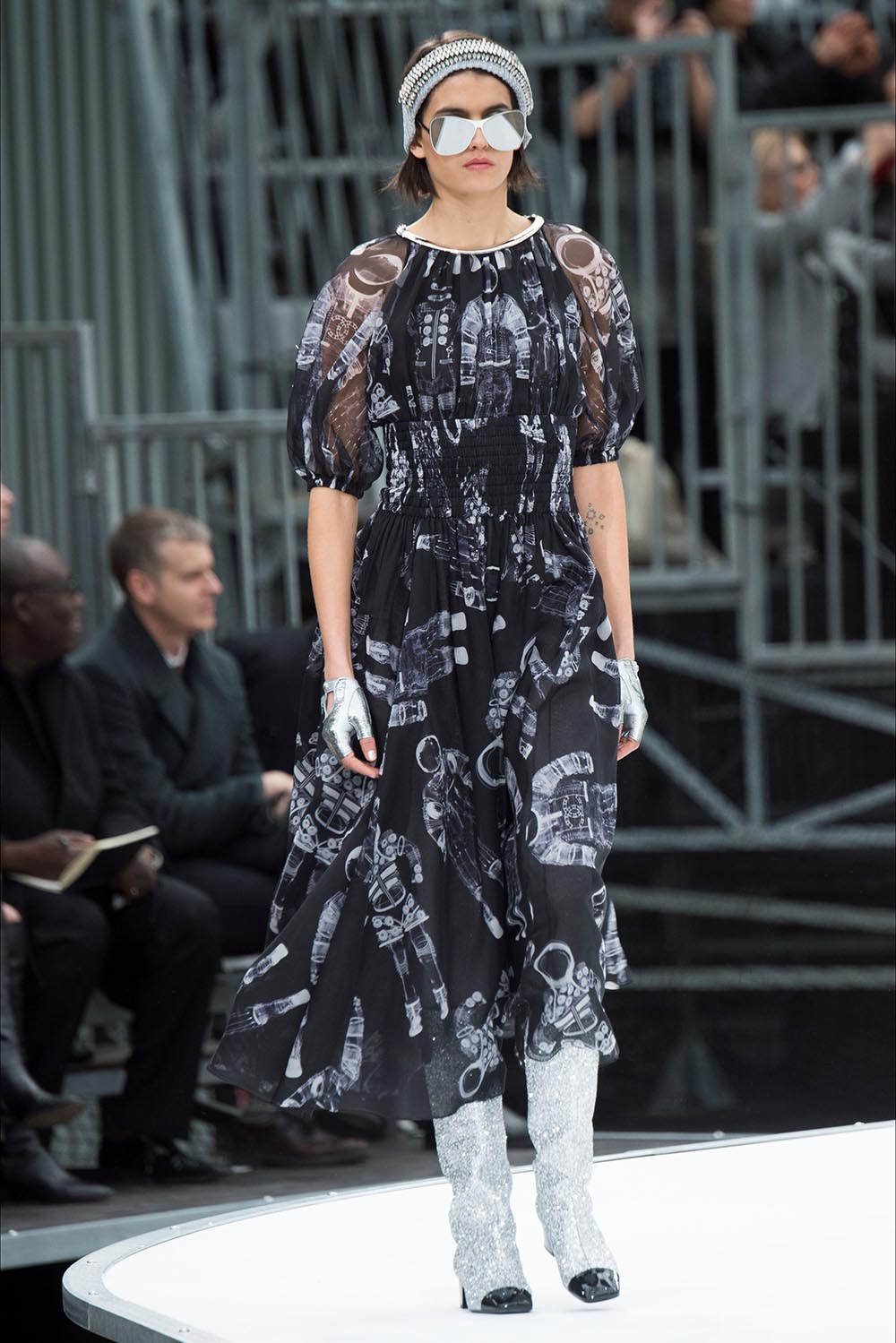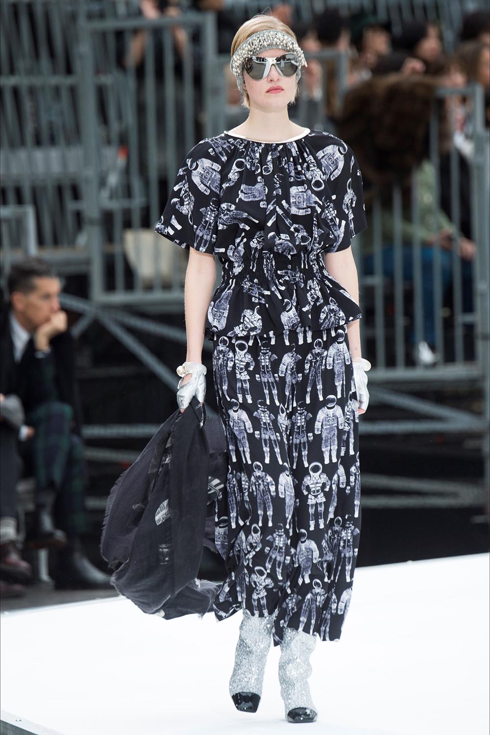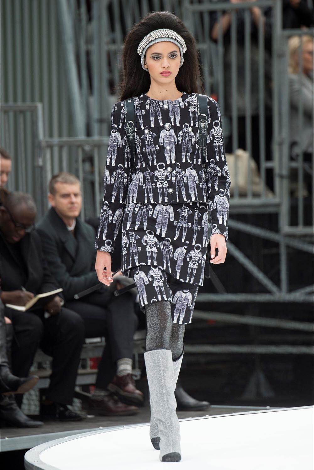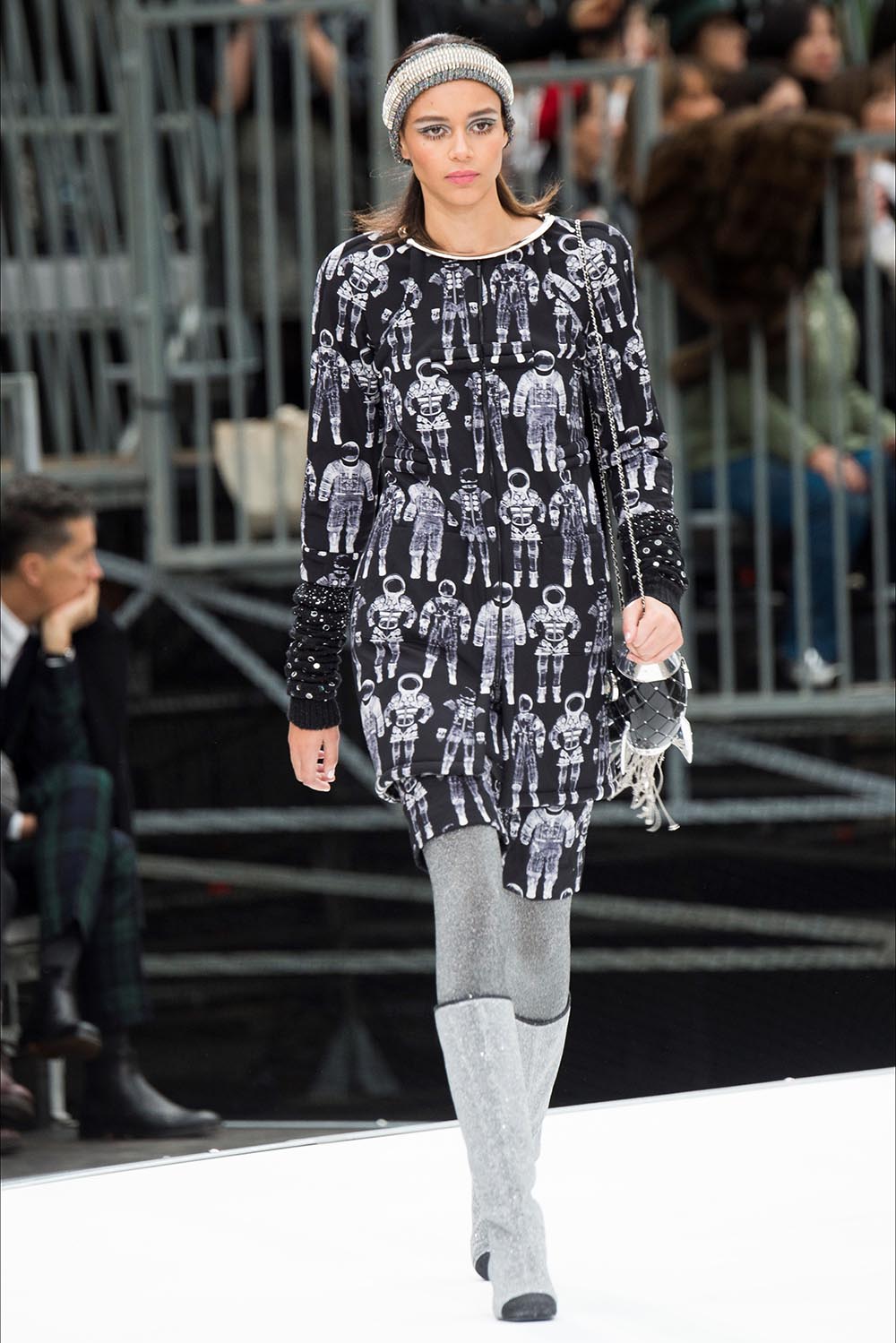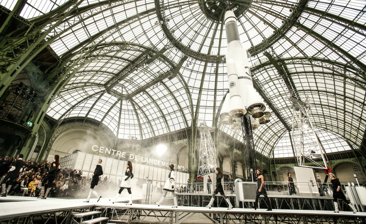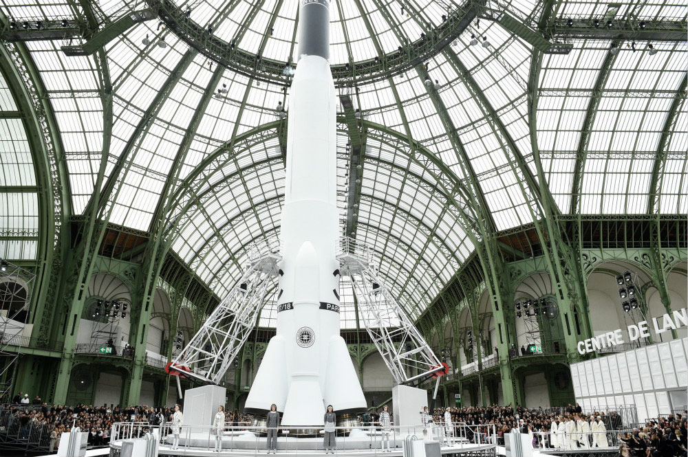 在这一季,Chanel向这股堙灭已久的太空风潮掷去枚高能炮弹——2017秋冬高级成衣系列的发布秀场被布置成了香奈儿5号火箭发射中心,位于中心的35米高的火箭直指大皇宫玻璃穹顶。