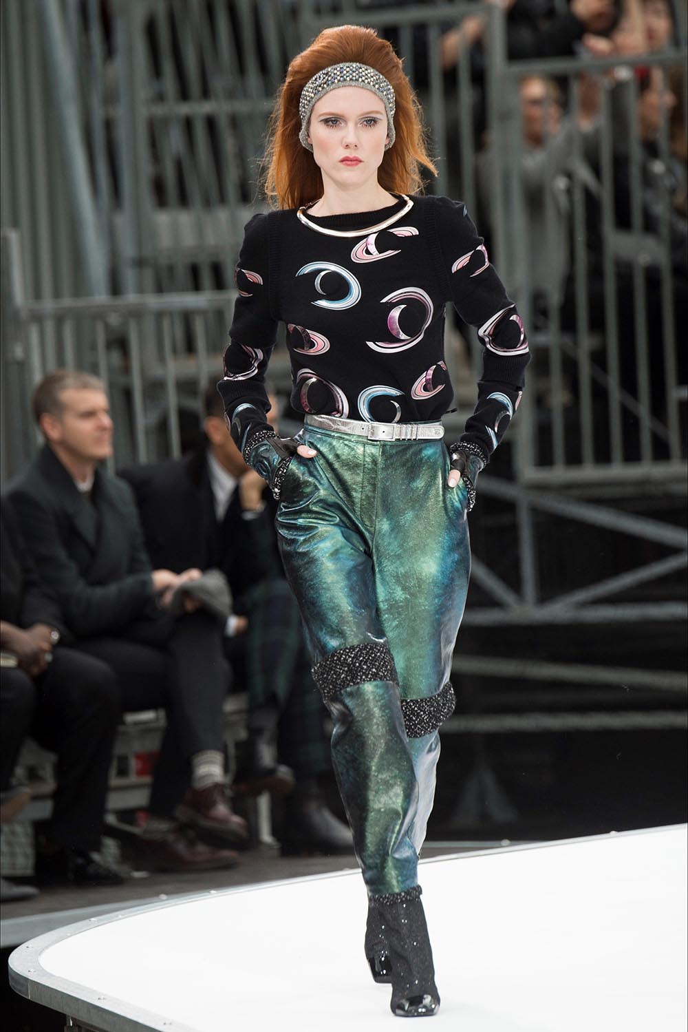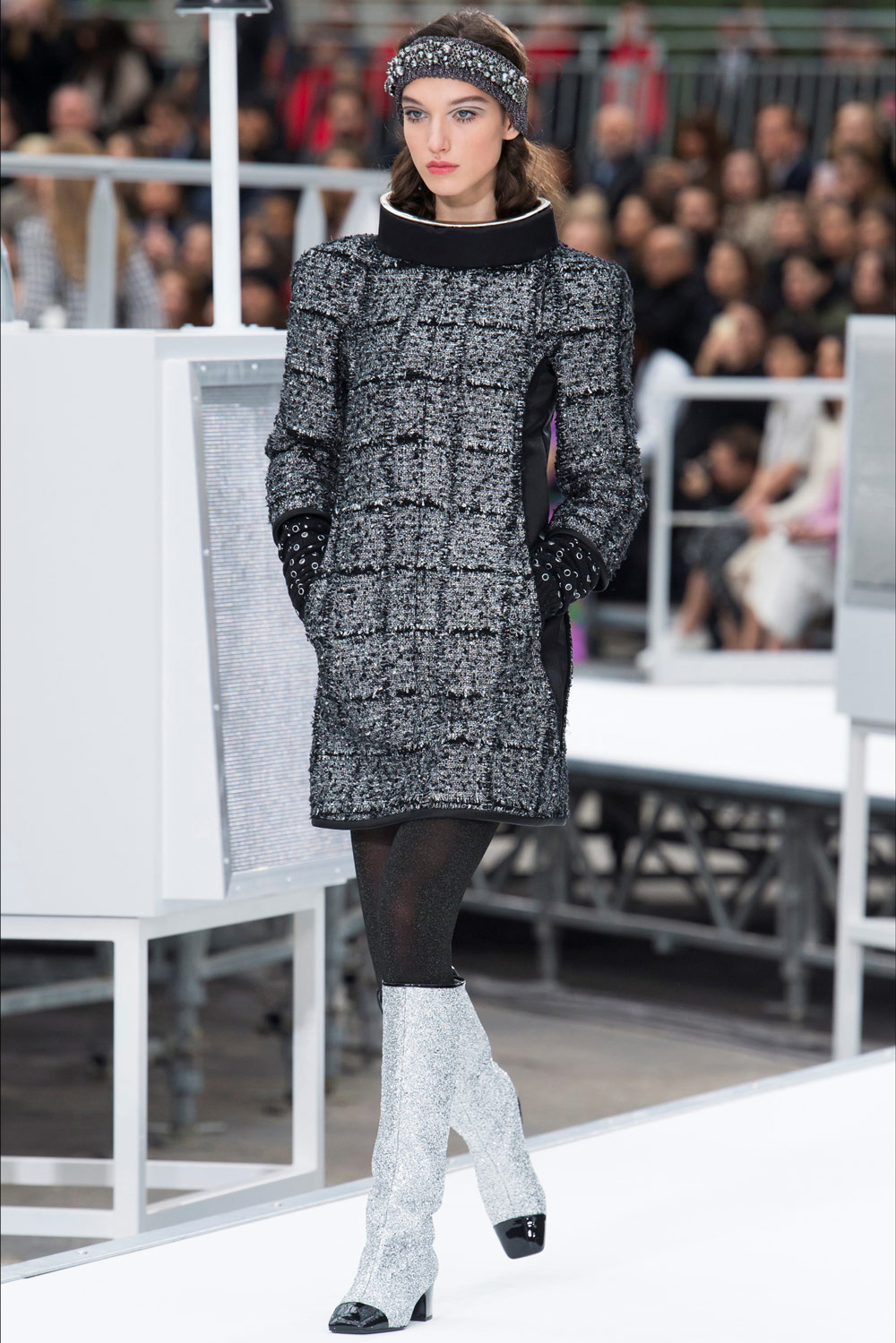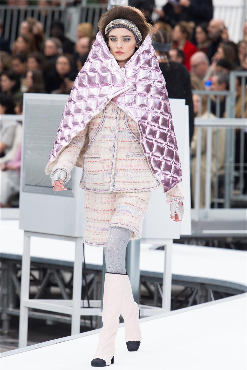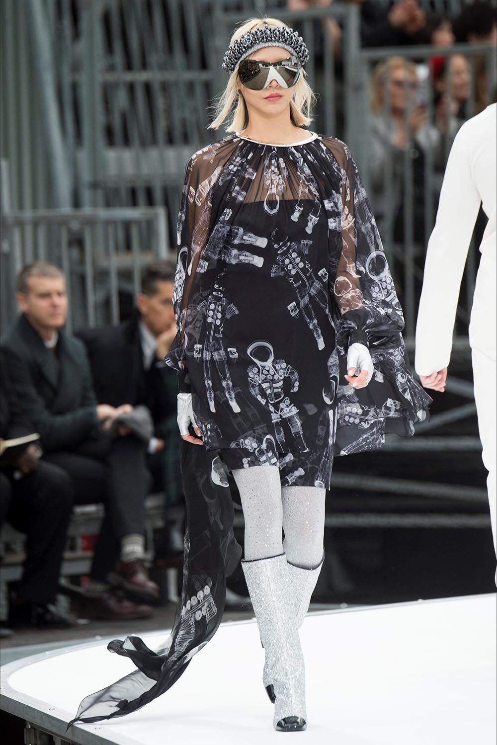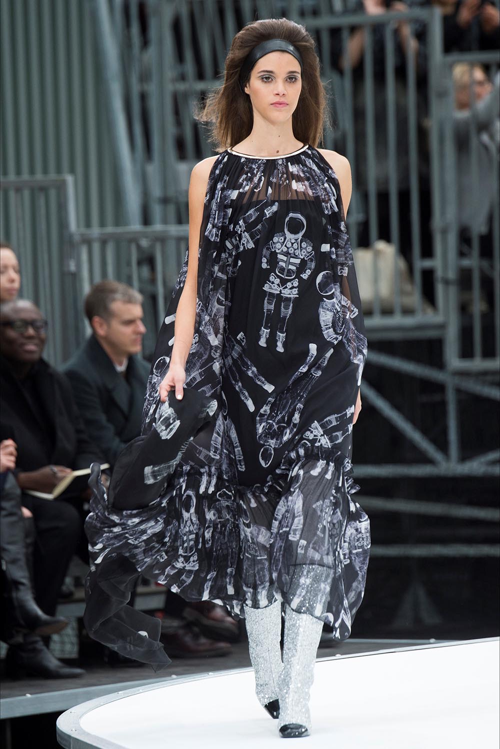 在这一季,Chanel向这股堙灭已久的太空风潮掷去枚高能炮弹——2017秋冬高级成衣系列的发布秀场被布置成了香奈儿5号火箭发射中心,位于中心的35米高的火箭直指大皇宫玻璃穹顶。