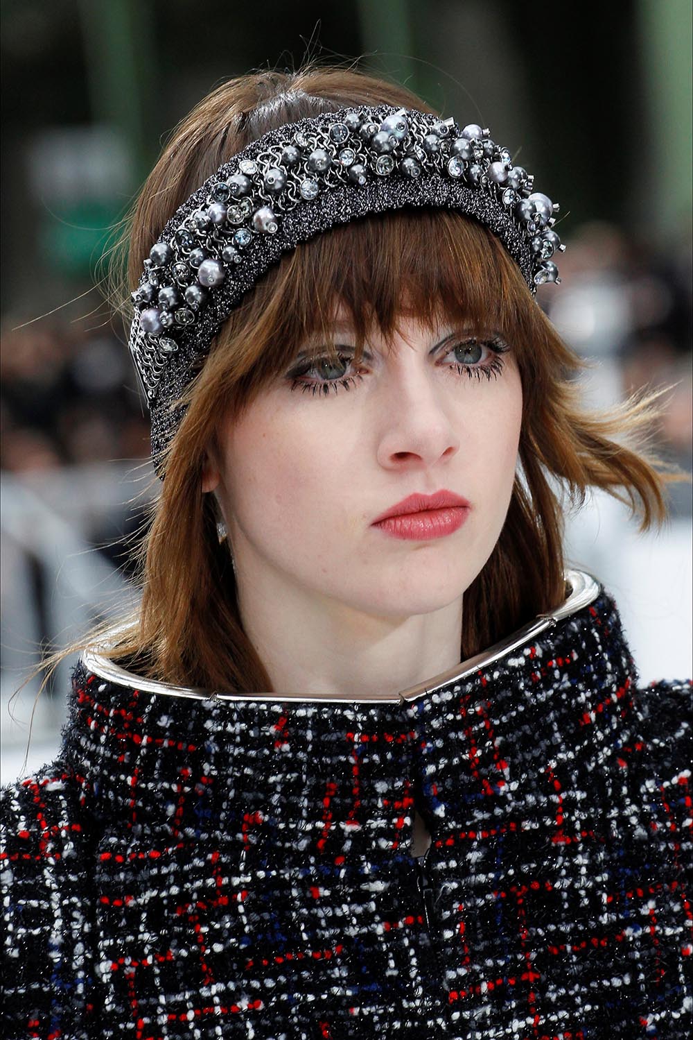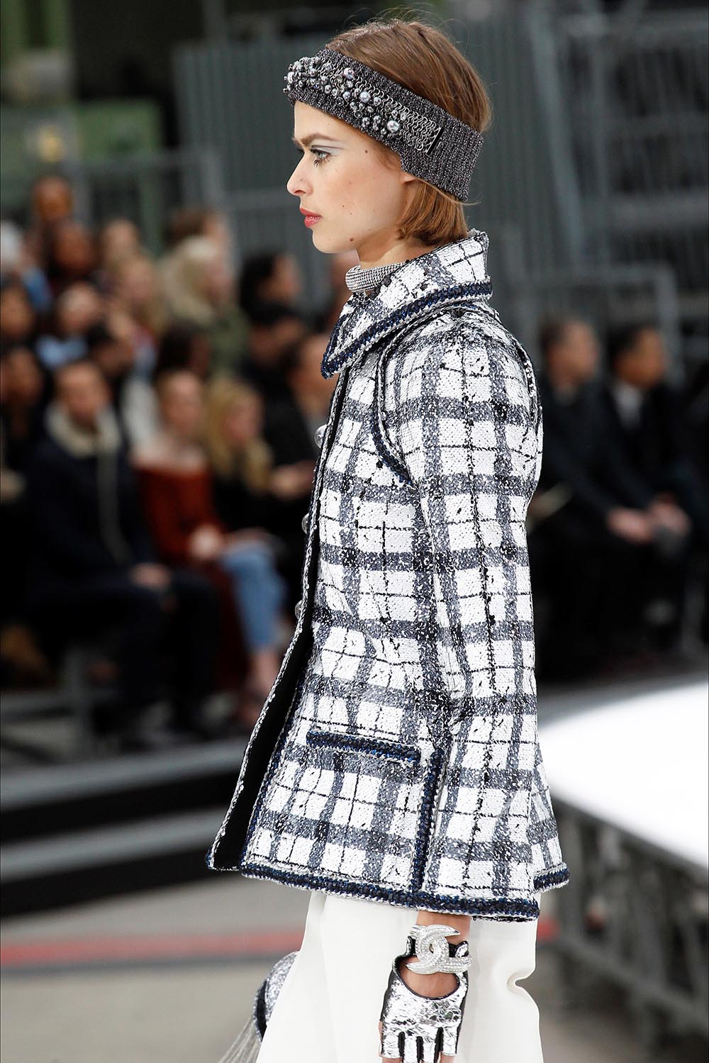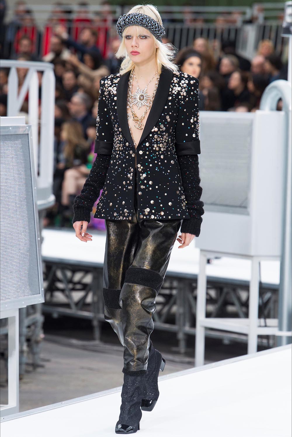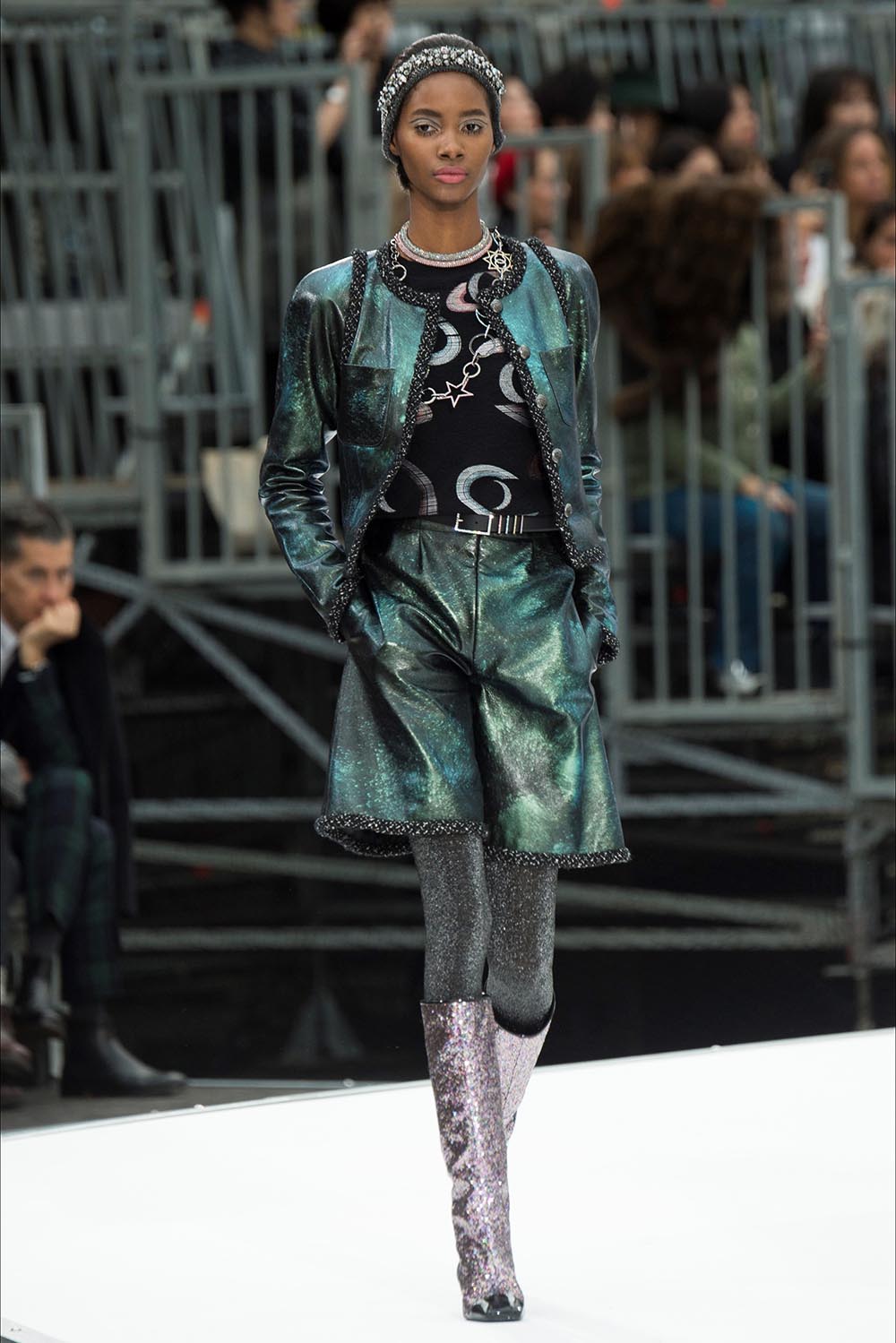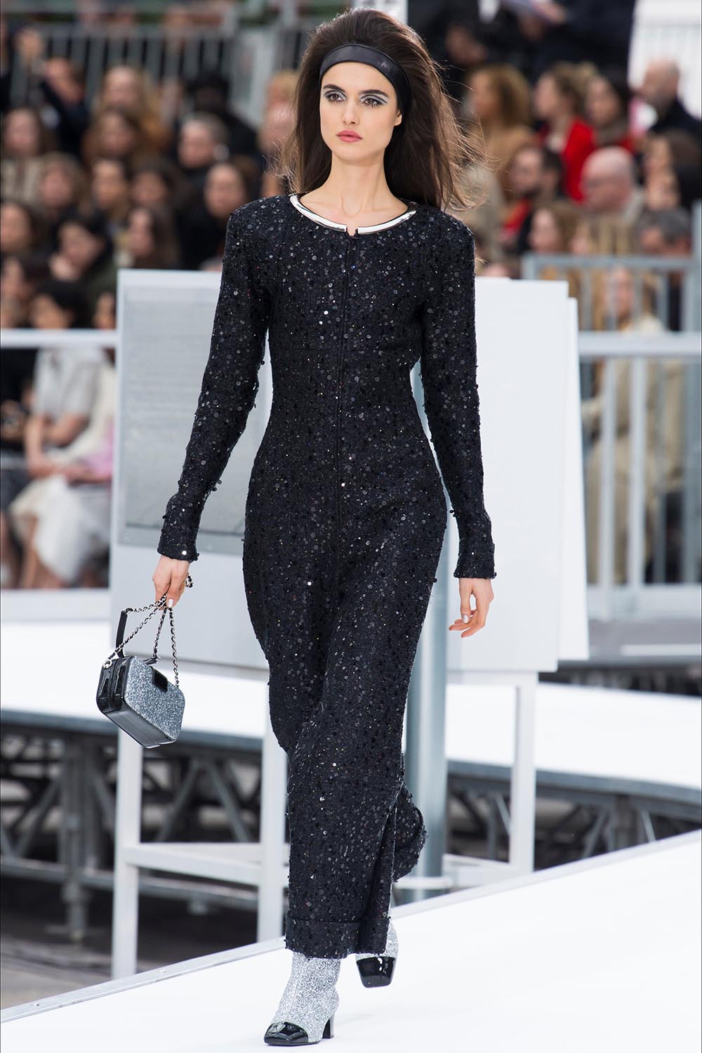 模特头戴绣有水晶和人造珍珠的发带,就如同银河。在配饰方面,2017春夏首发的Gabrielle手袋、饰有徽章图案的BOY CHANEL,以及闪光材质的超大号手袋接连登场。