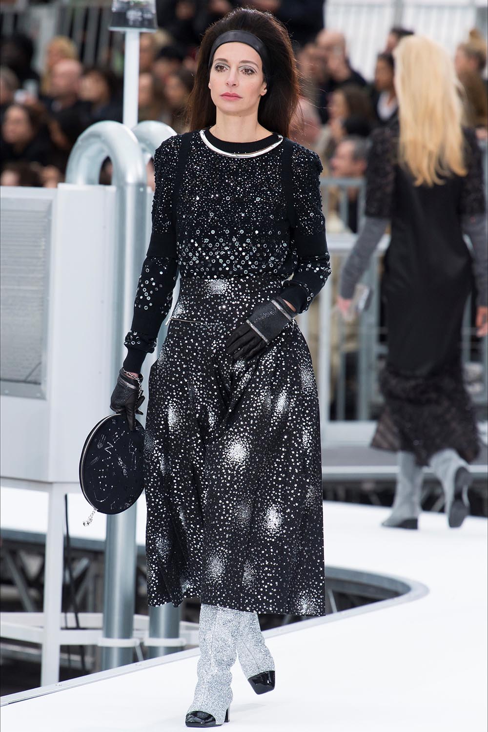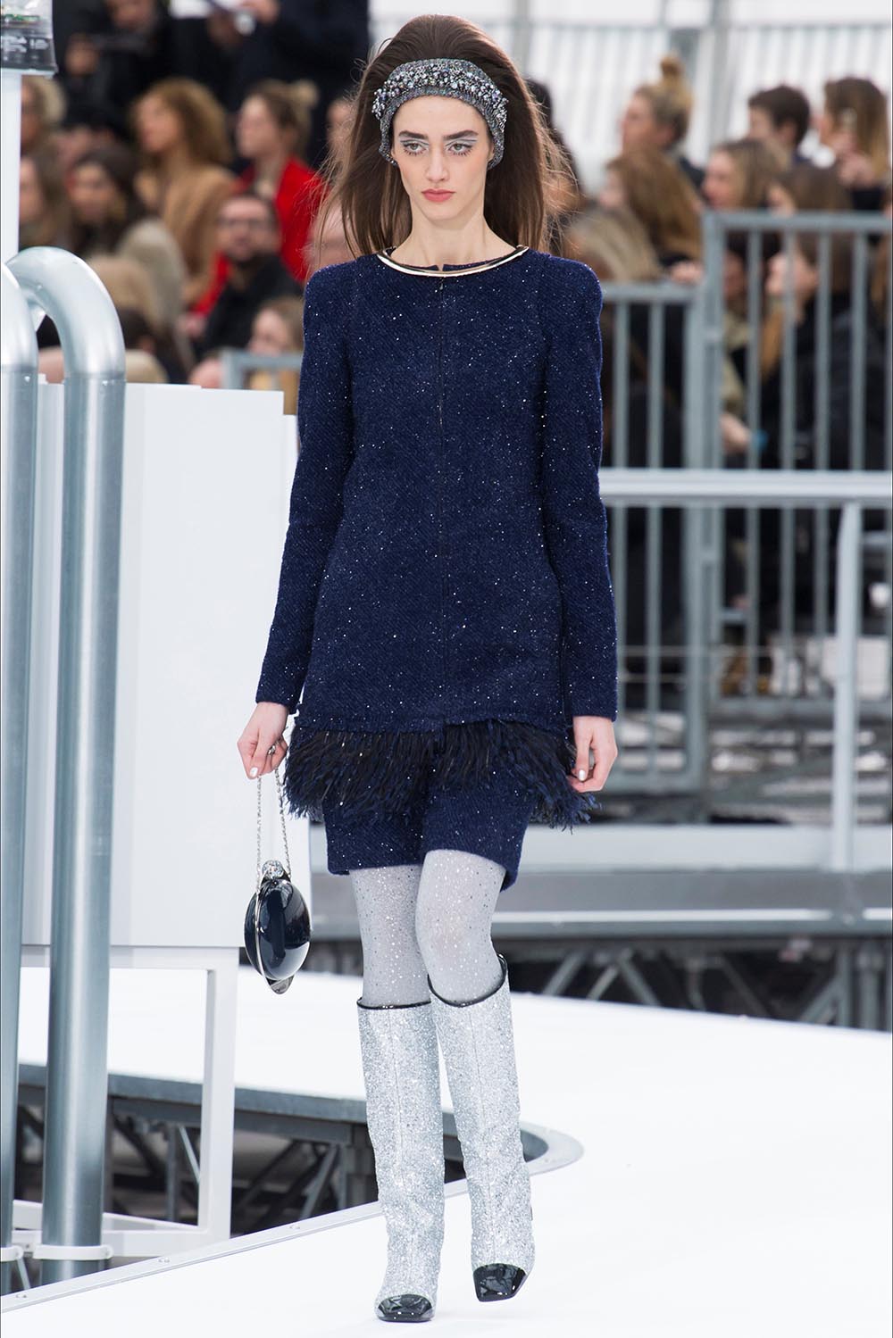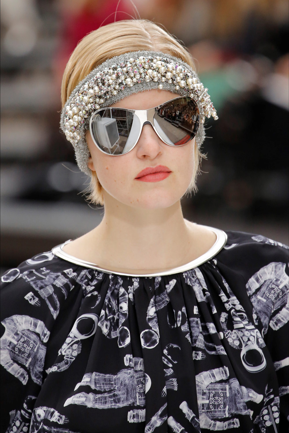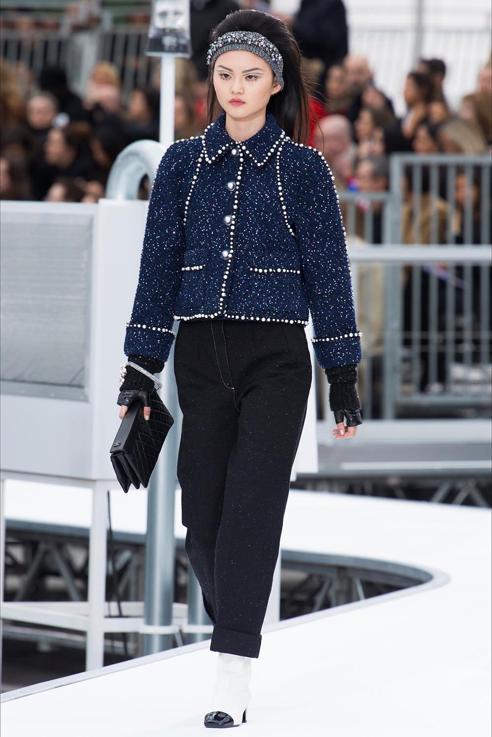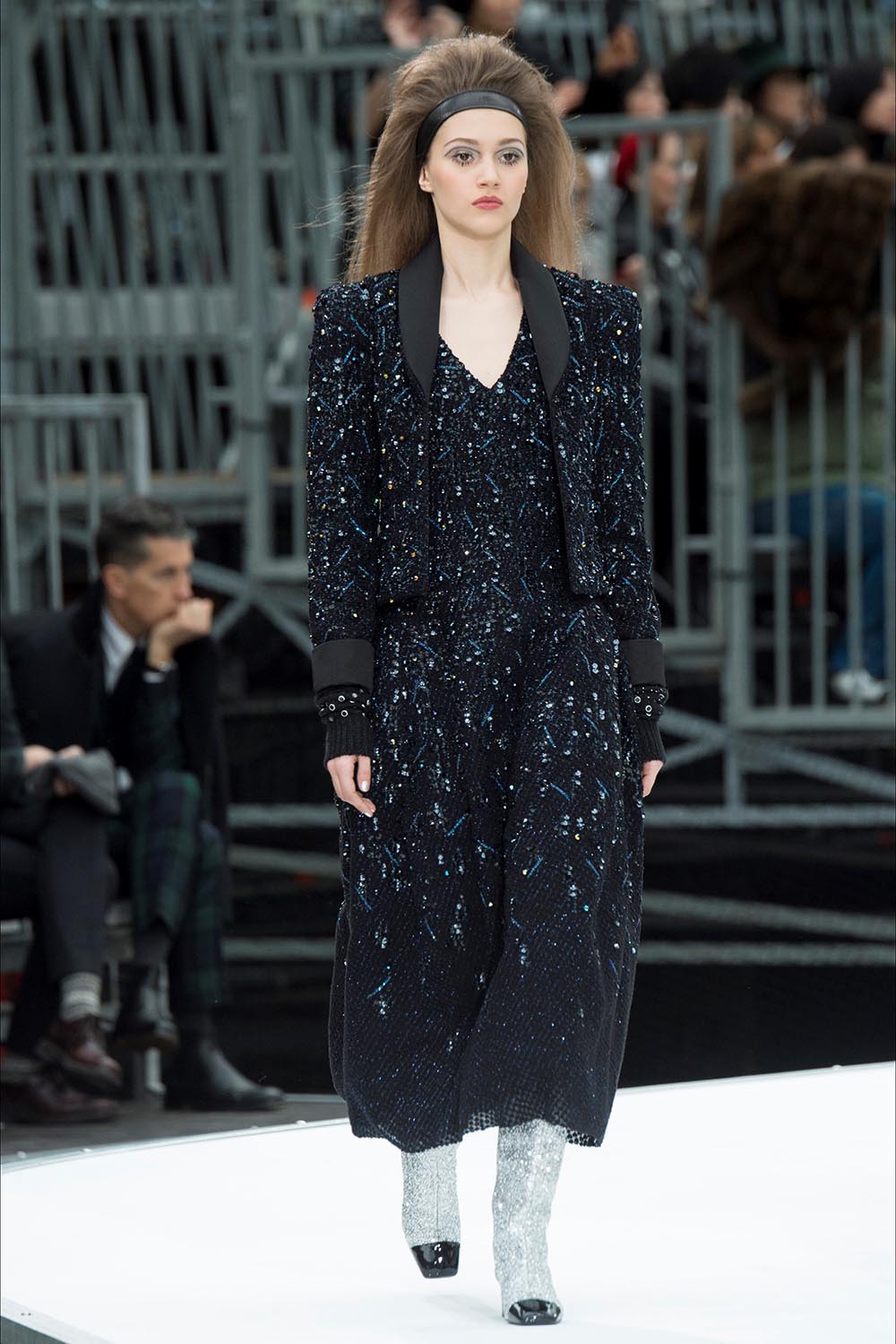 模特头戴绣有水晶和人造珍珠的发带,就如同银河。在配饰方面,2017春夏首发的Gabrielle手袋、饰有徽章图案的BOY CHANEL,以及闪光材质的超大号手袋接连登场。