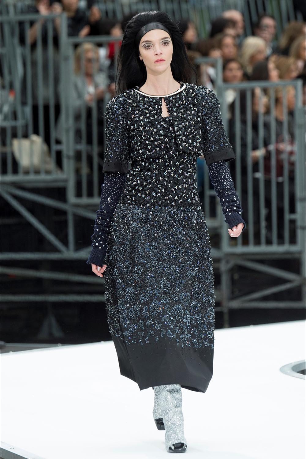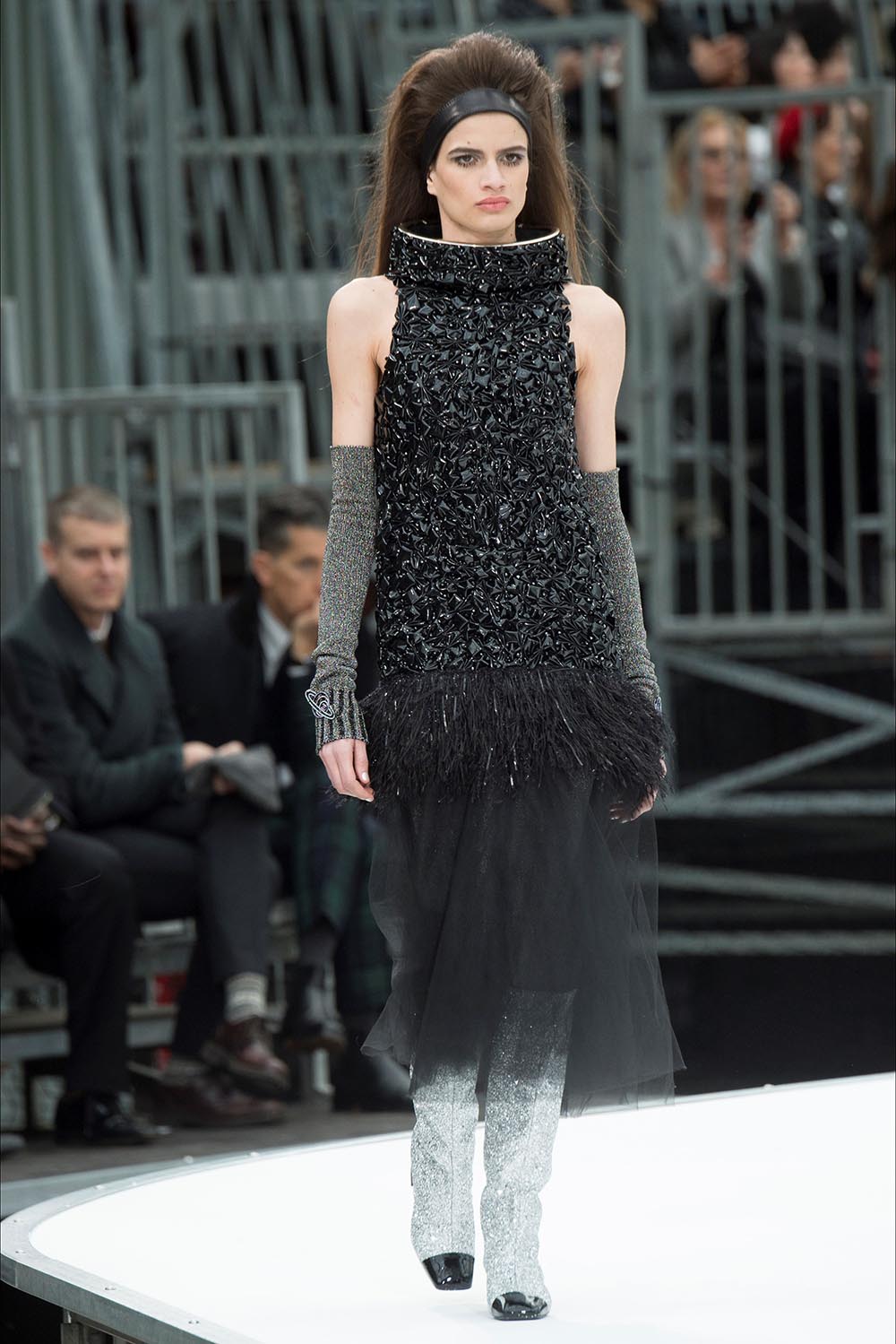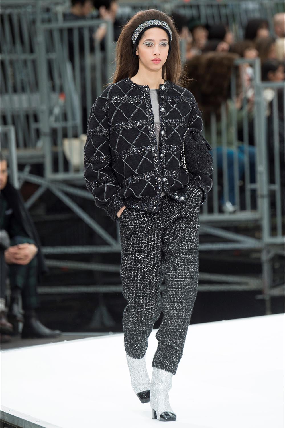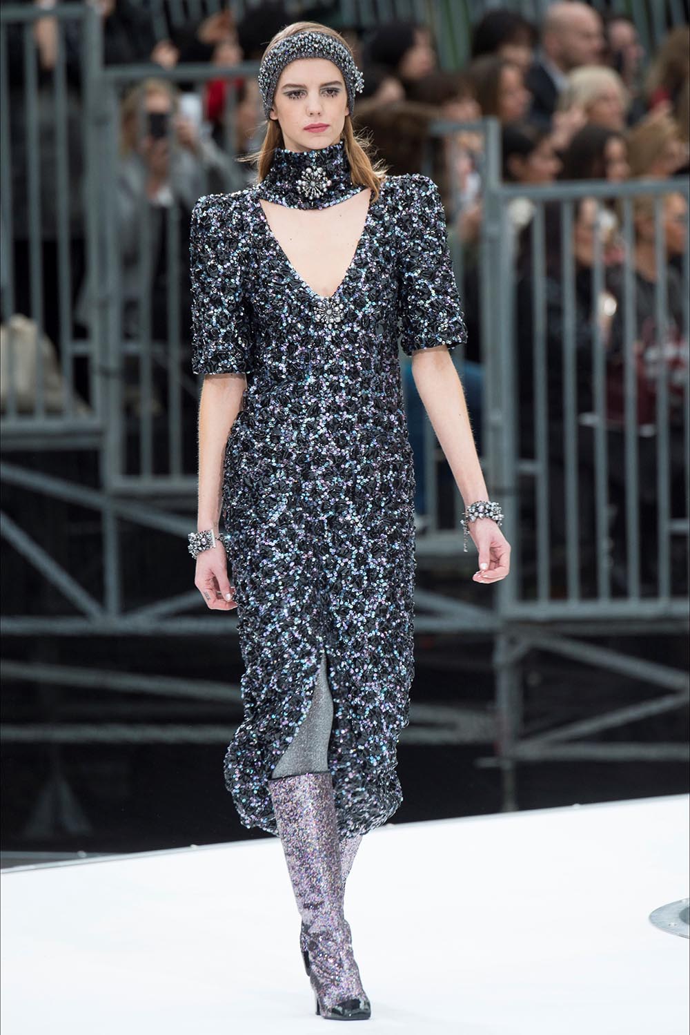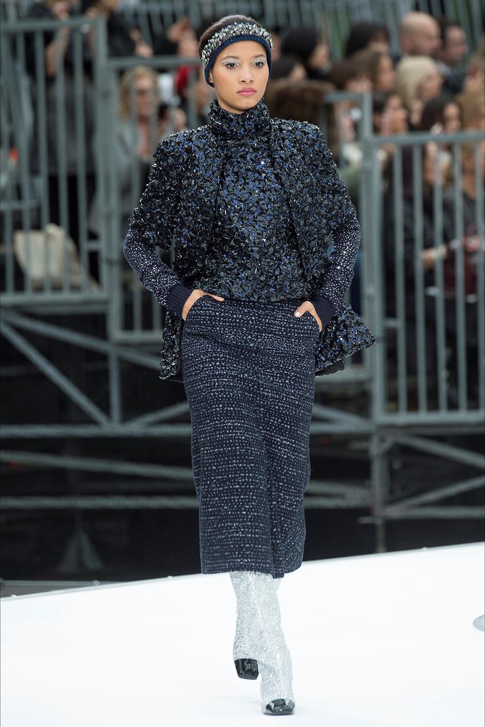 模特头戴绣有水晶和人造珍珠的发带,就如同银河。在配饰方面,2017春夏首发的Gabrielle手袋、饰有徽章图案的BOY CHANEL,以及闪光材质的超大号手袋接连登场。