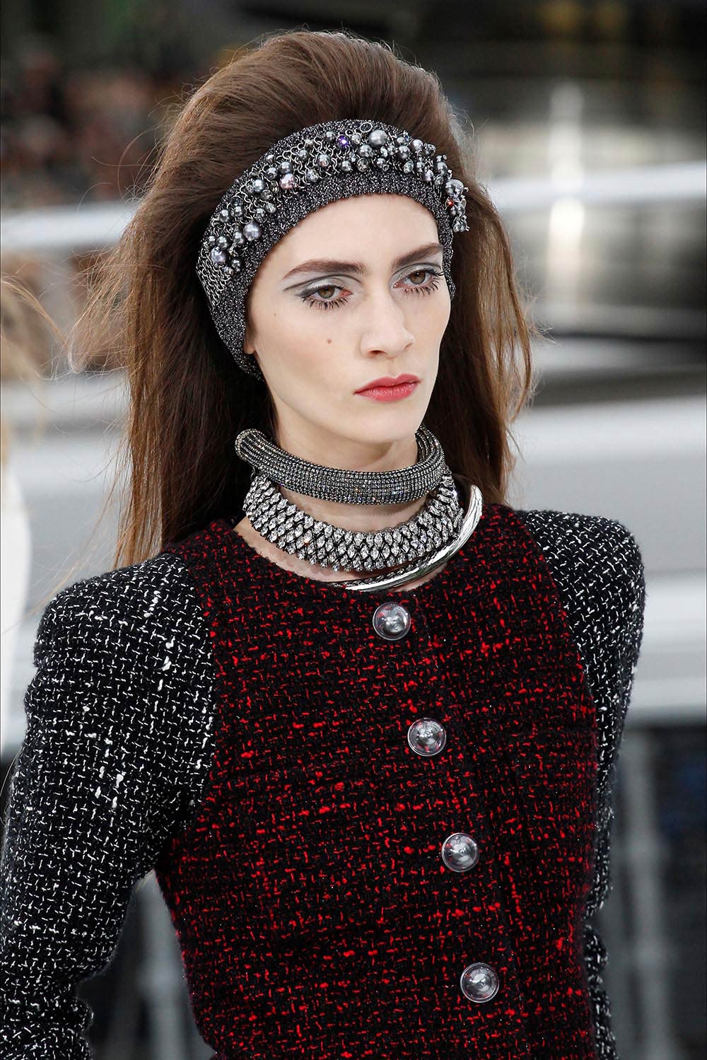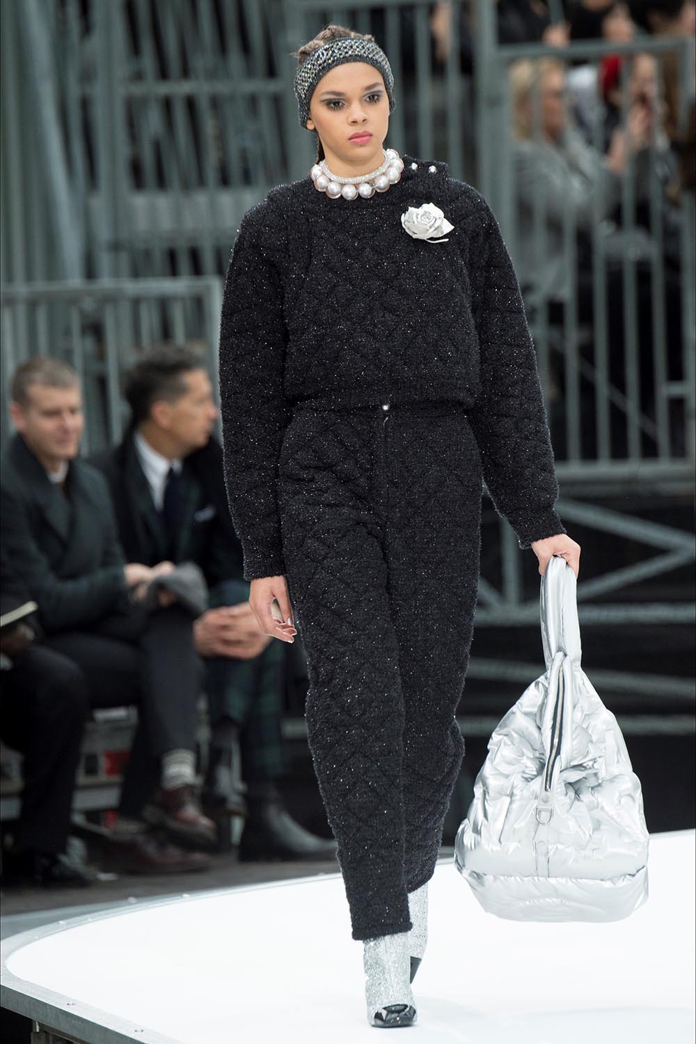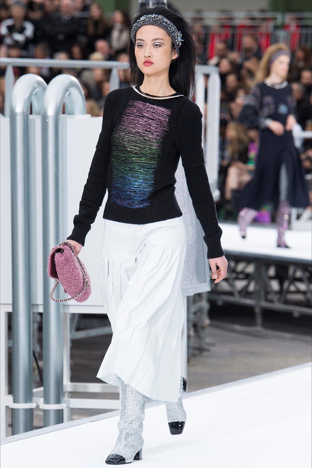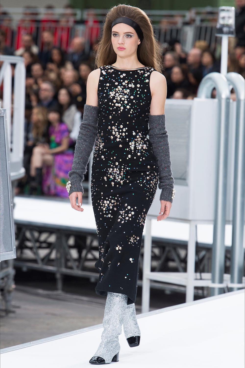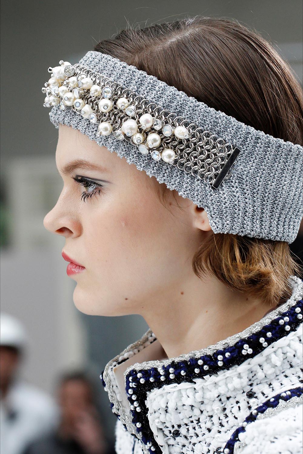 模特头戴绣有水晶和人造珍珠的发带,就如同银河。在配饰方面,2017春夏首发的Gabrielle手袋、饰有徽章图案的BOY CHANEL,以及闪光材质的超大号手袋接连登场。