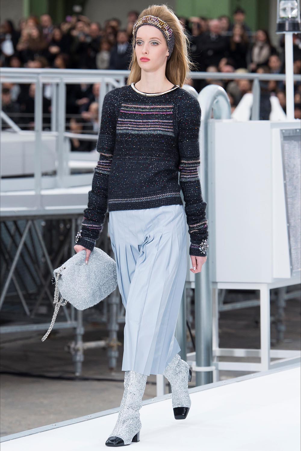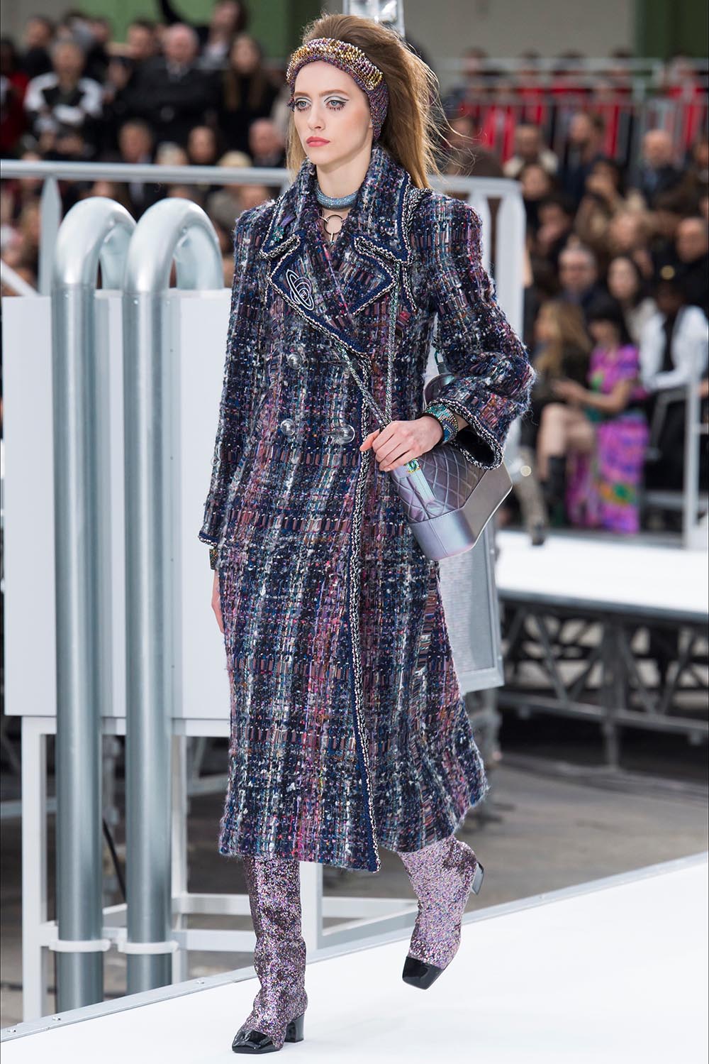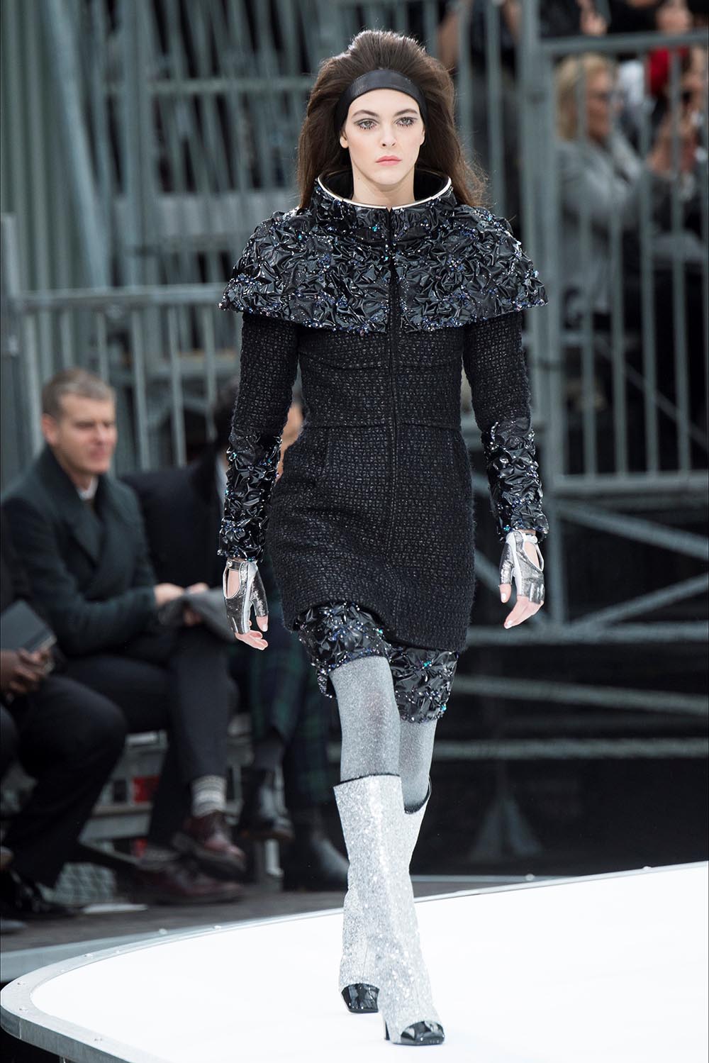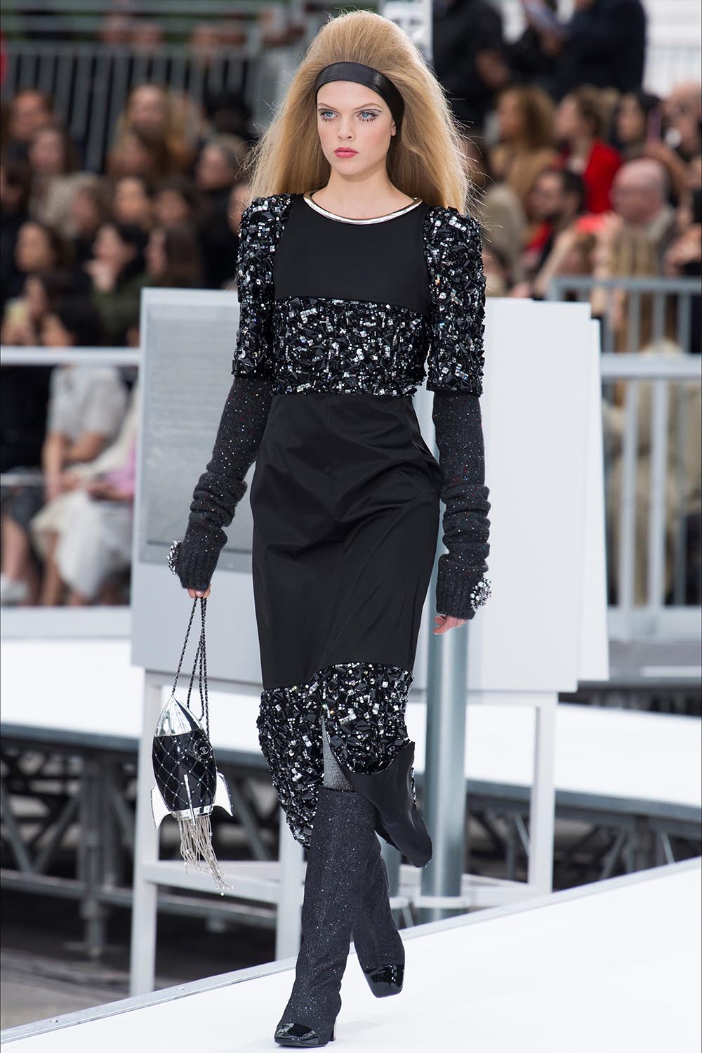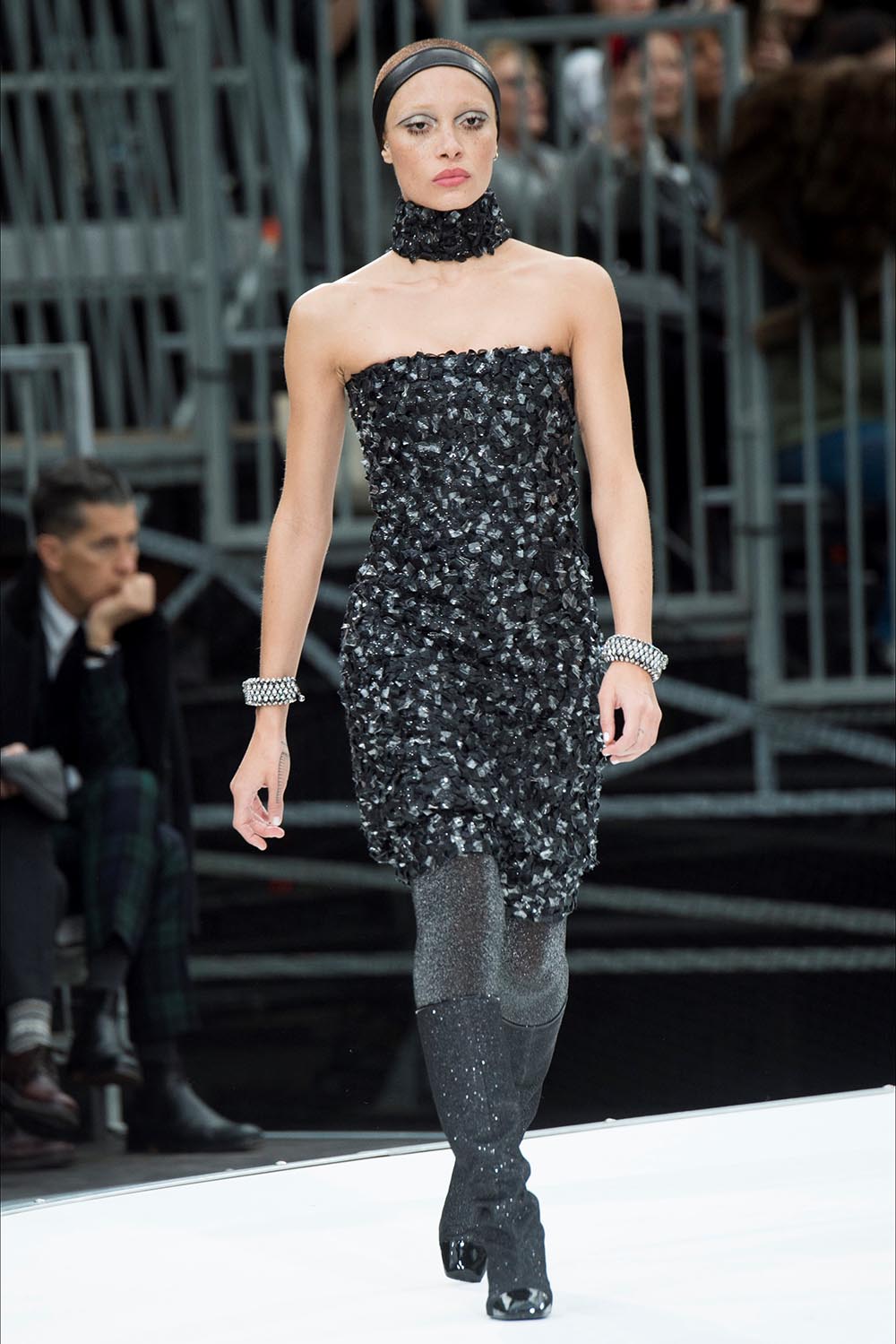 模特头戴绣有水晶和人造珍珠的发带,就如同银河。在配饰方面,2017春夏首发的Gabrielle手袋、饰有徽章图案的BOY CHANEL,以及闪光材质的超大号手袋接连登场。