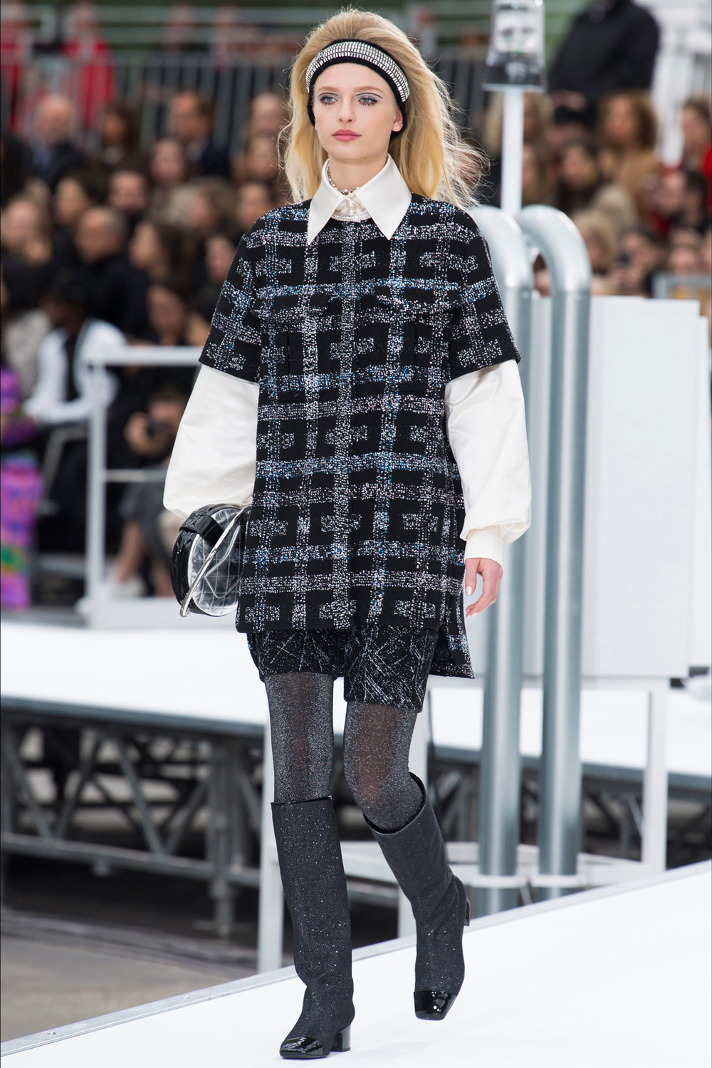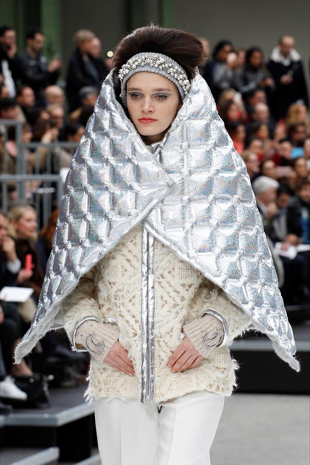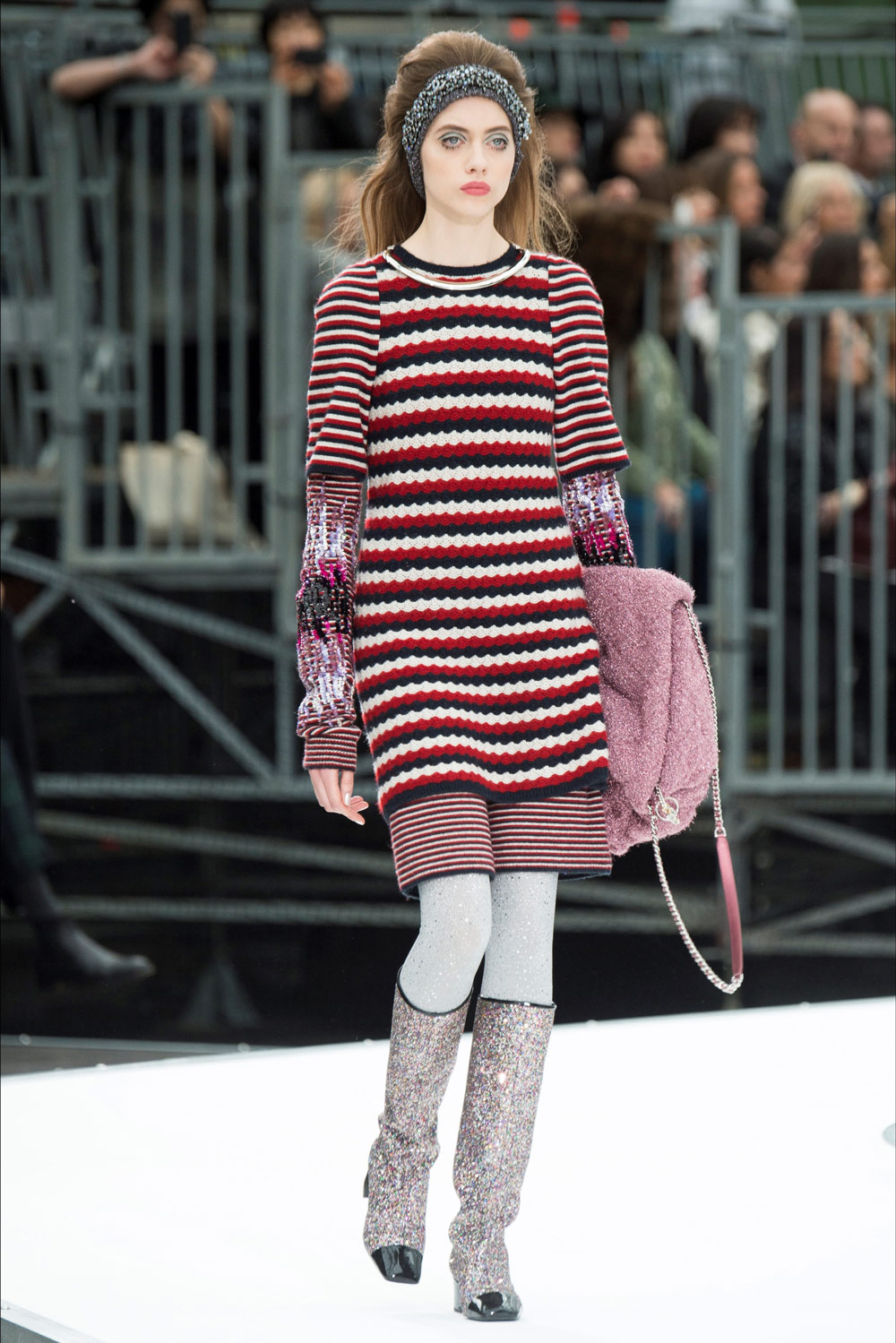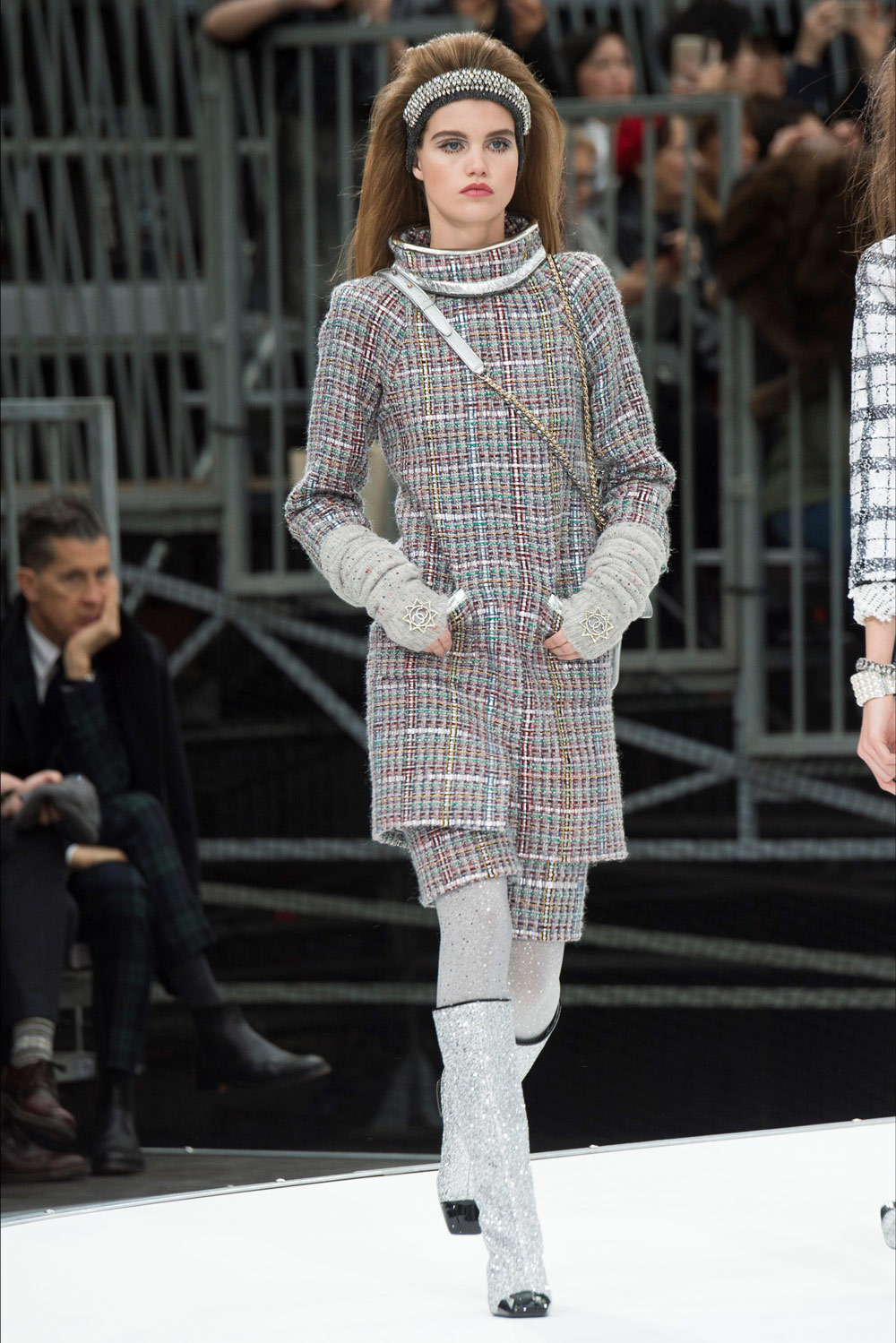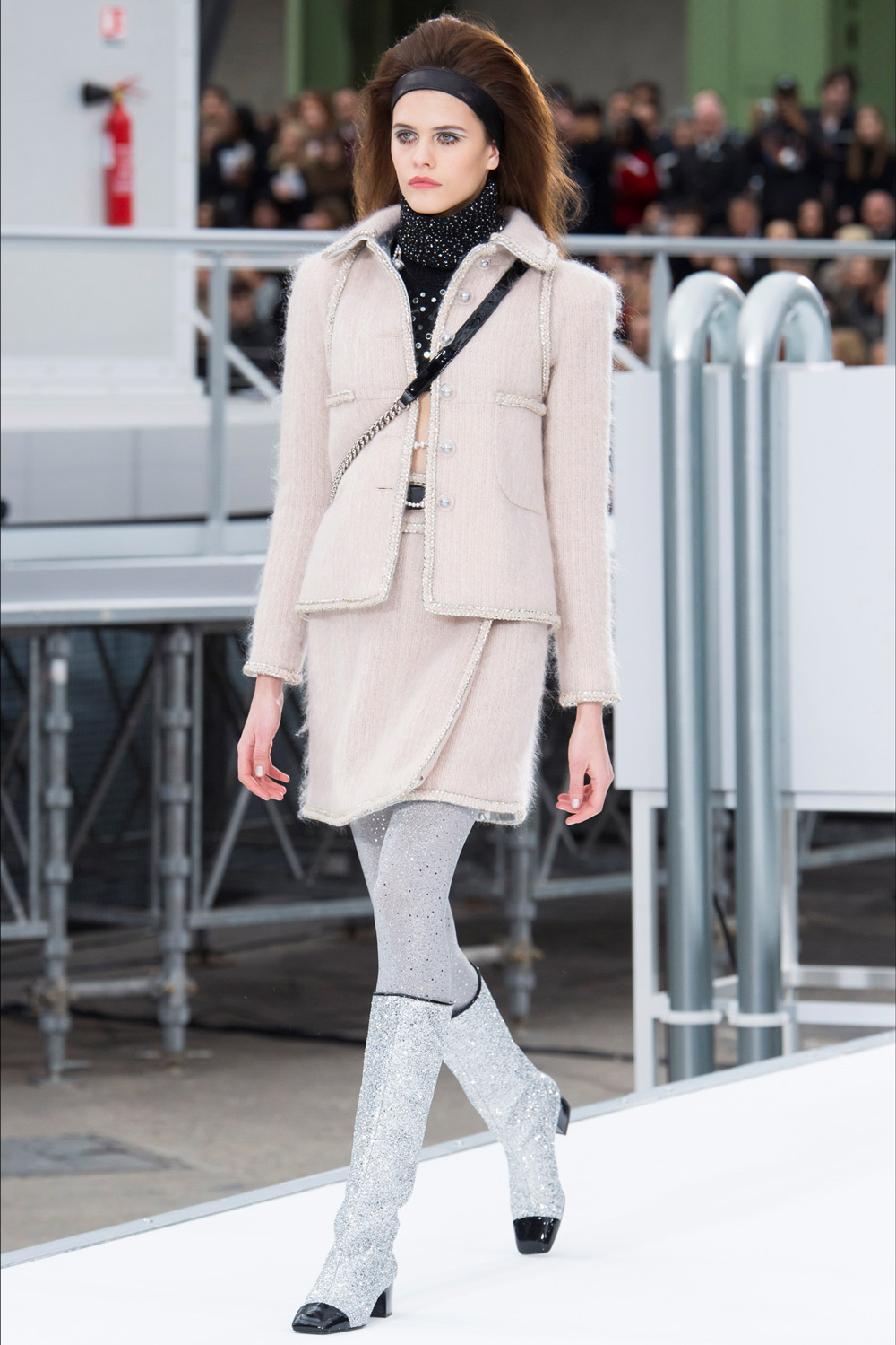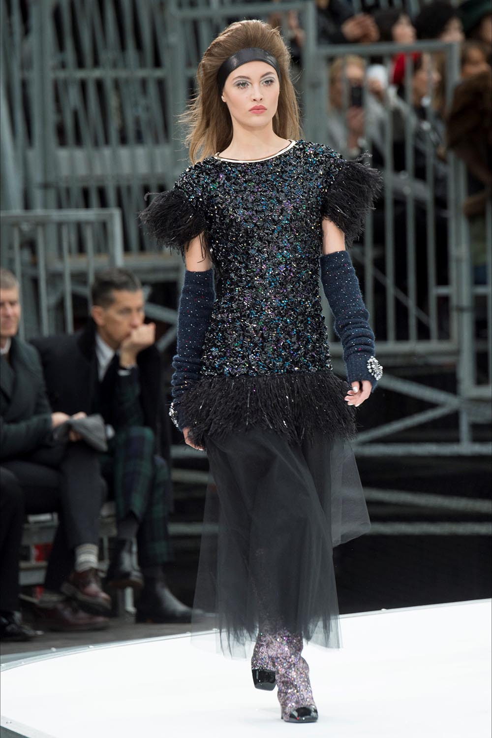 模特头戴绣有水晶和人造珍珠的发带,就如同银河。在配饰方面,2017春夏首发的Gabrielle手袋、饰有徽章图案的BOY CHANEL,以及闪光材质的超大号手袋接连登场。