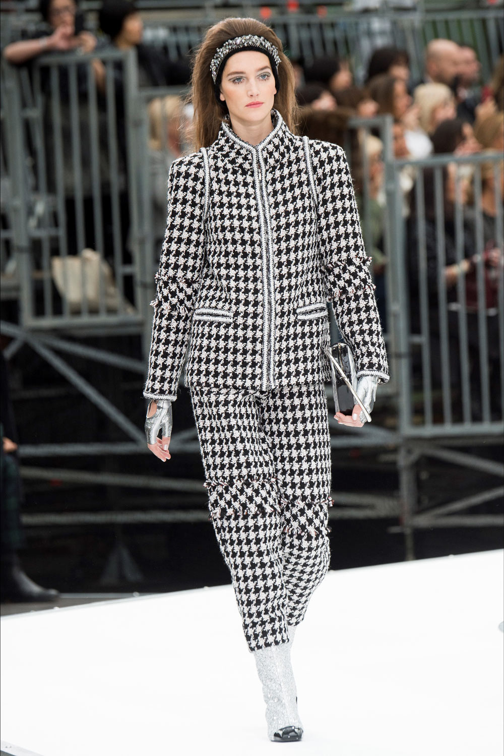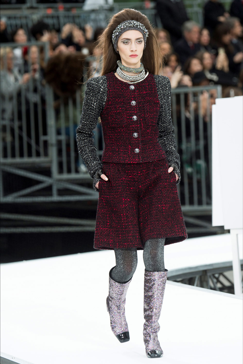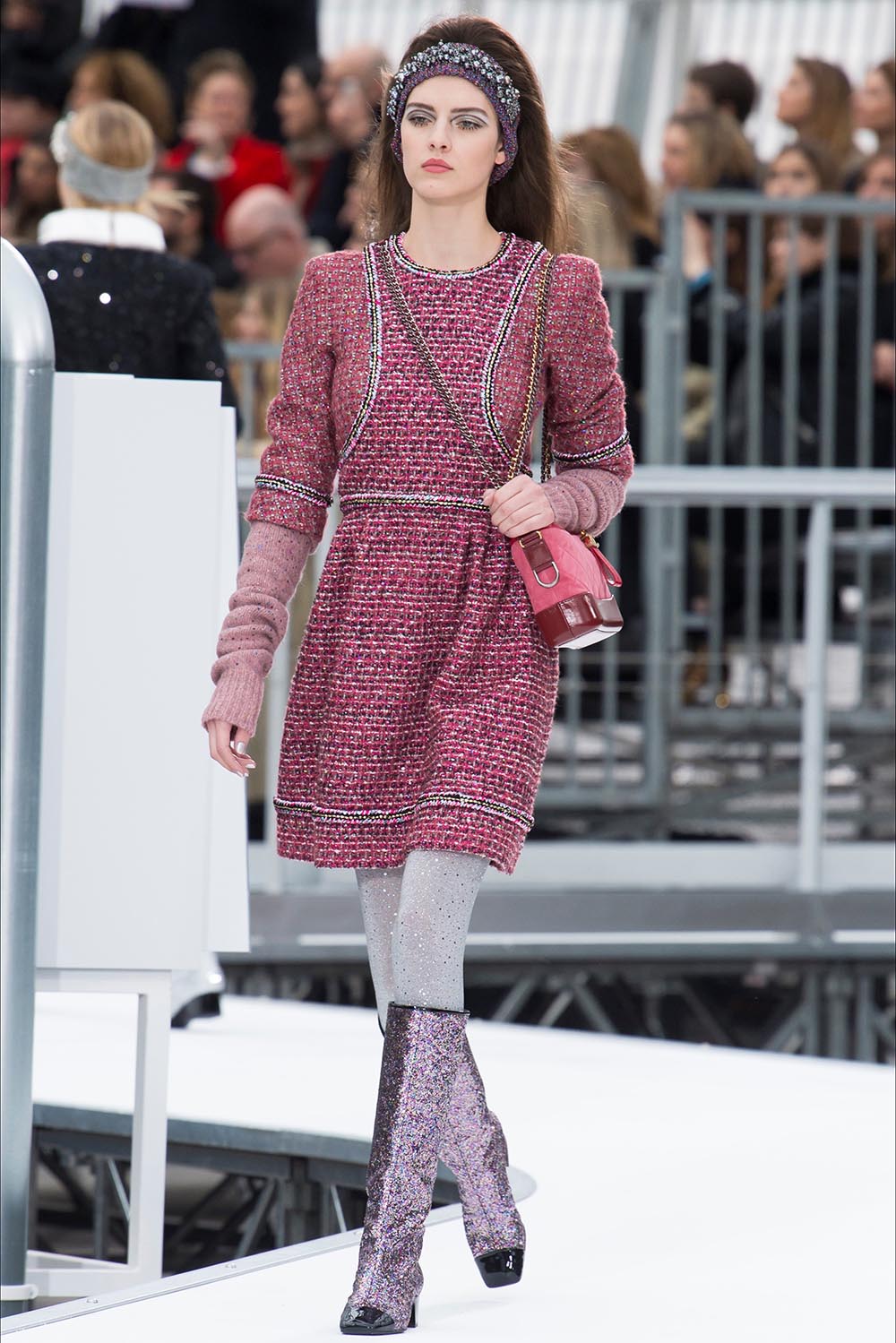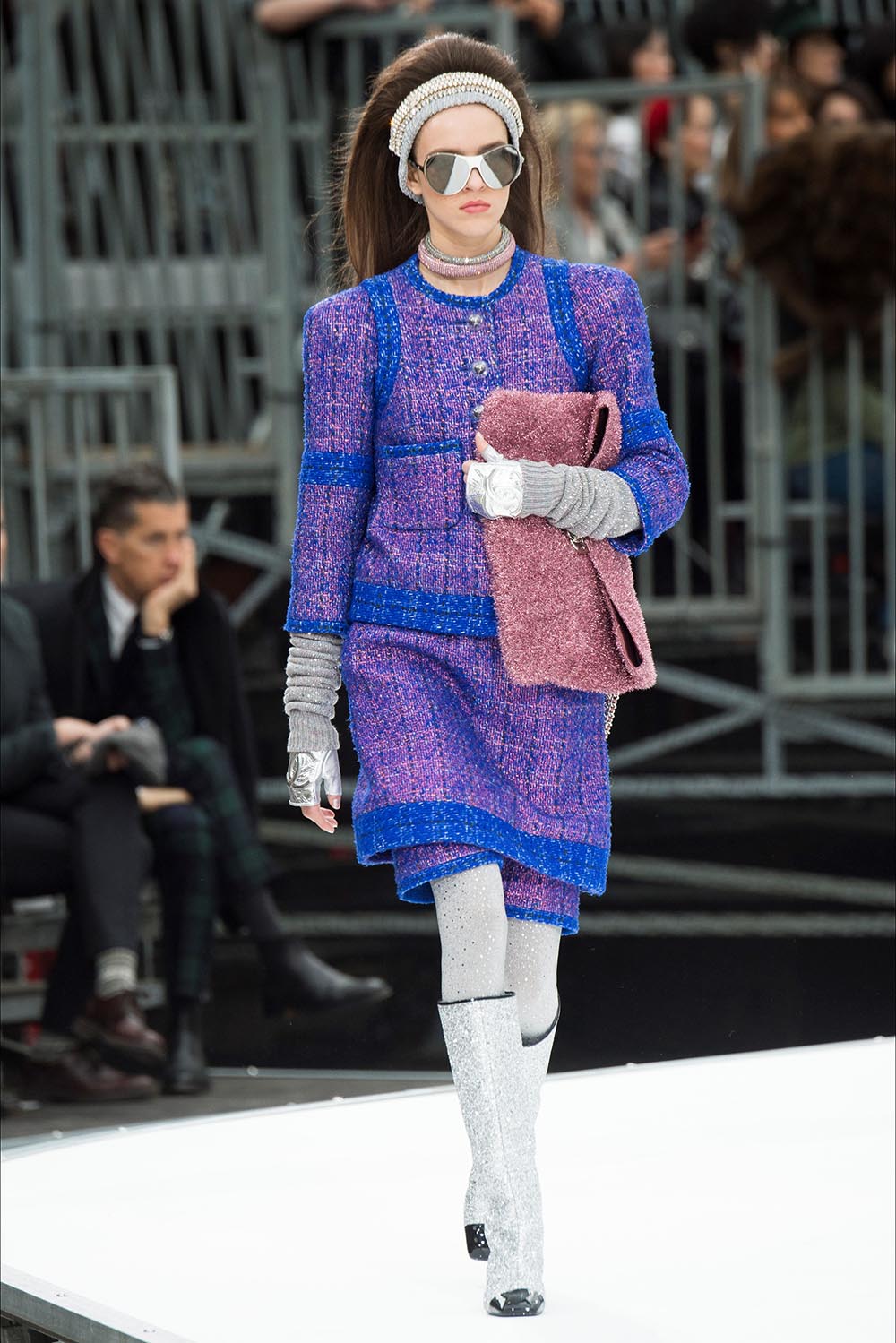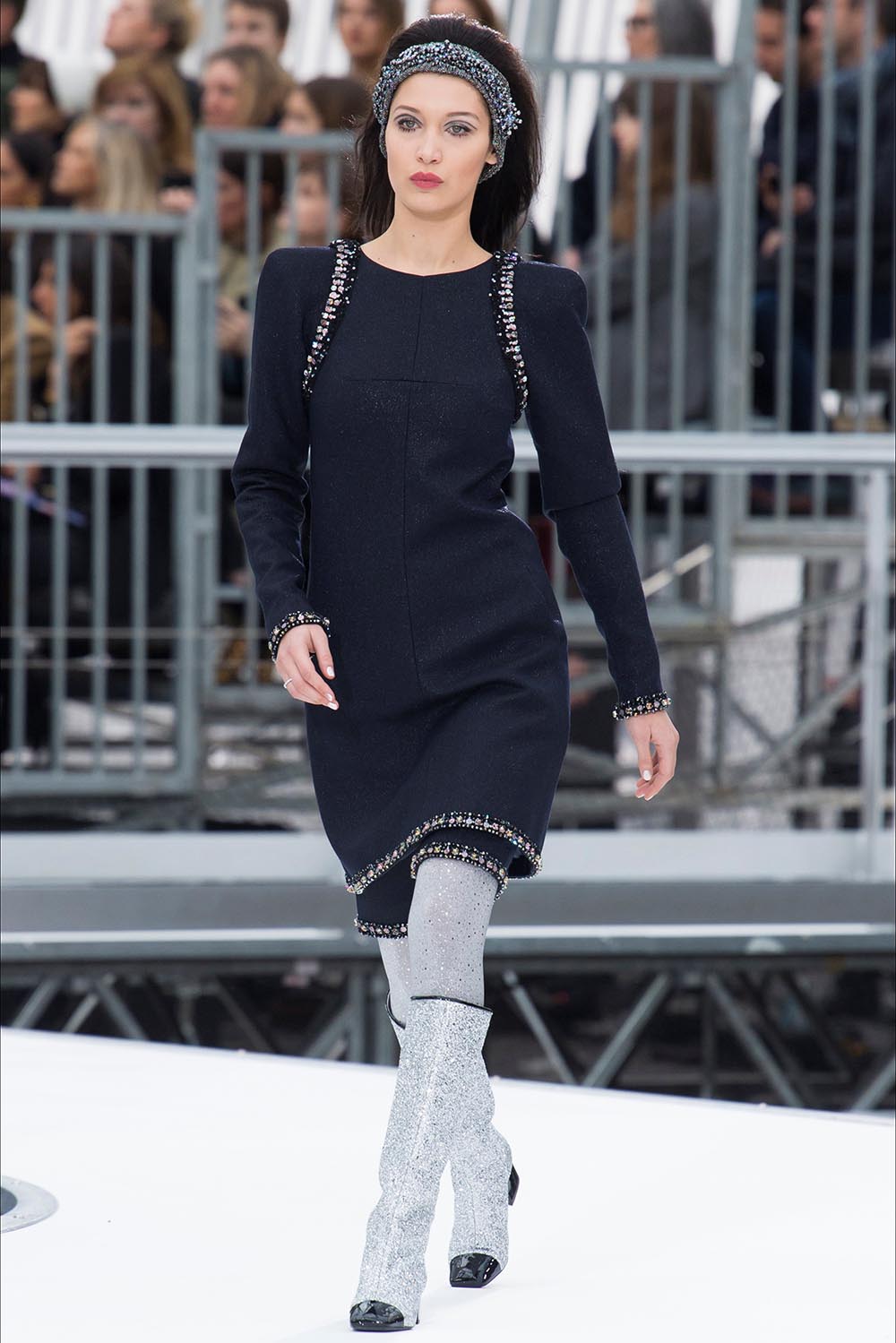 模特头戴绣有水晶和人造珍珠的发带,就如同银河。在配饰方面,2017春夏首发的Gabrielle手袋、饰有徽章图案的BOY CHANEL,以及闪光材质的超大号手袋接连登场。