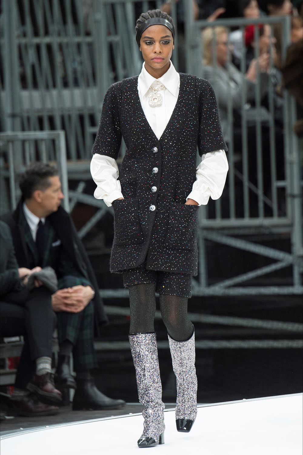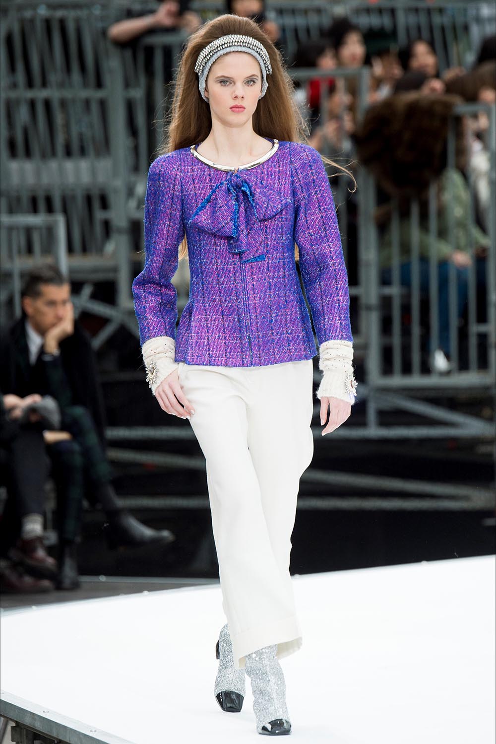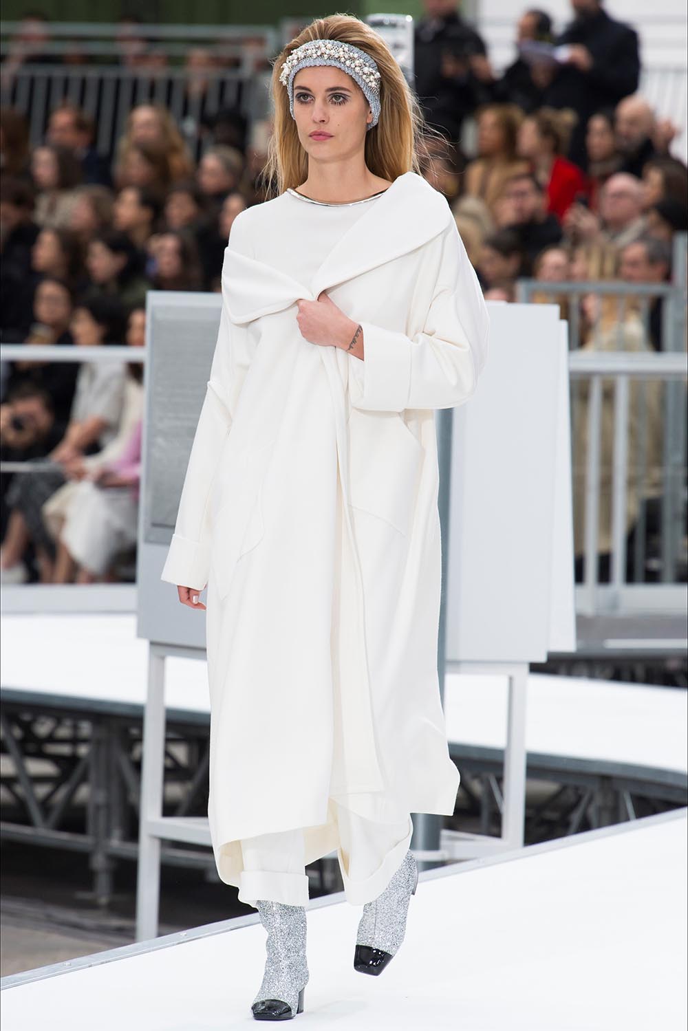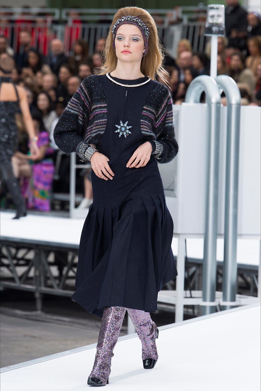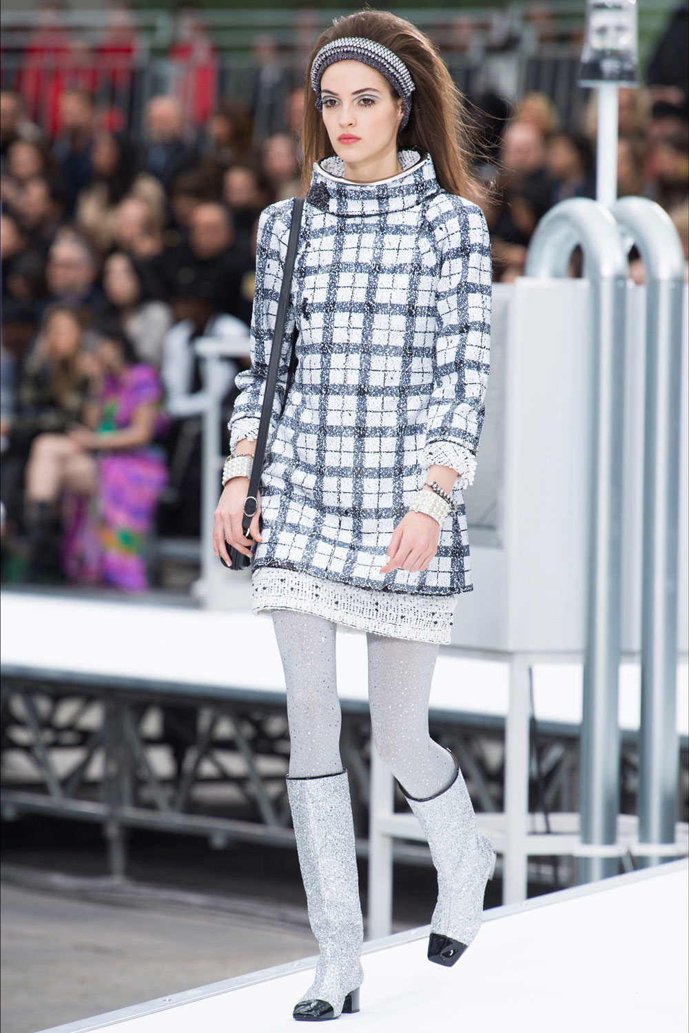 模特头戴绣有水晶和人造珍珠的发带,就如同银河。在配饰方面,2017春夏首发的Gabrielle手袋、饰有徽章图案的BOY CHANEL,以及闪光材质的超大号手袋接连登场。