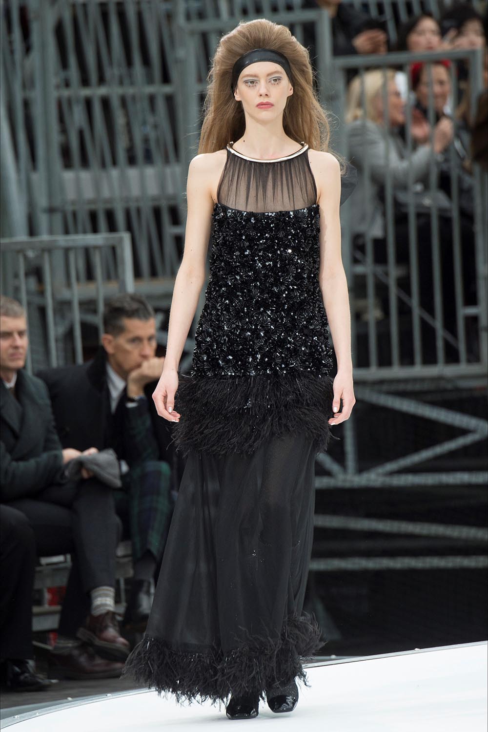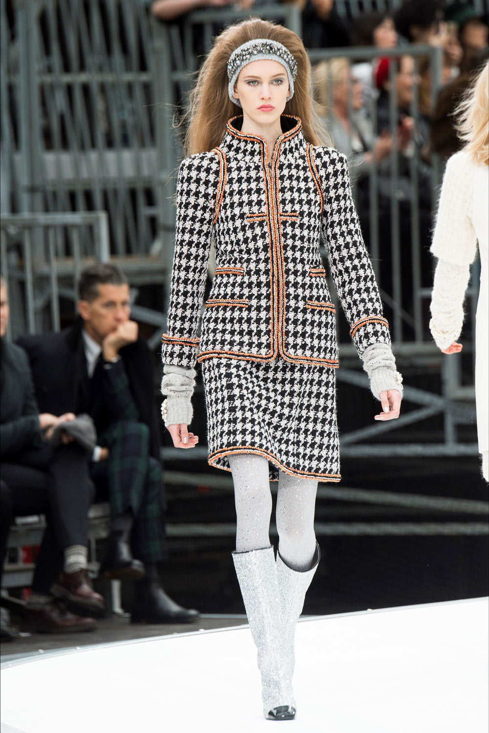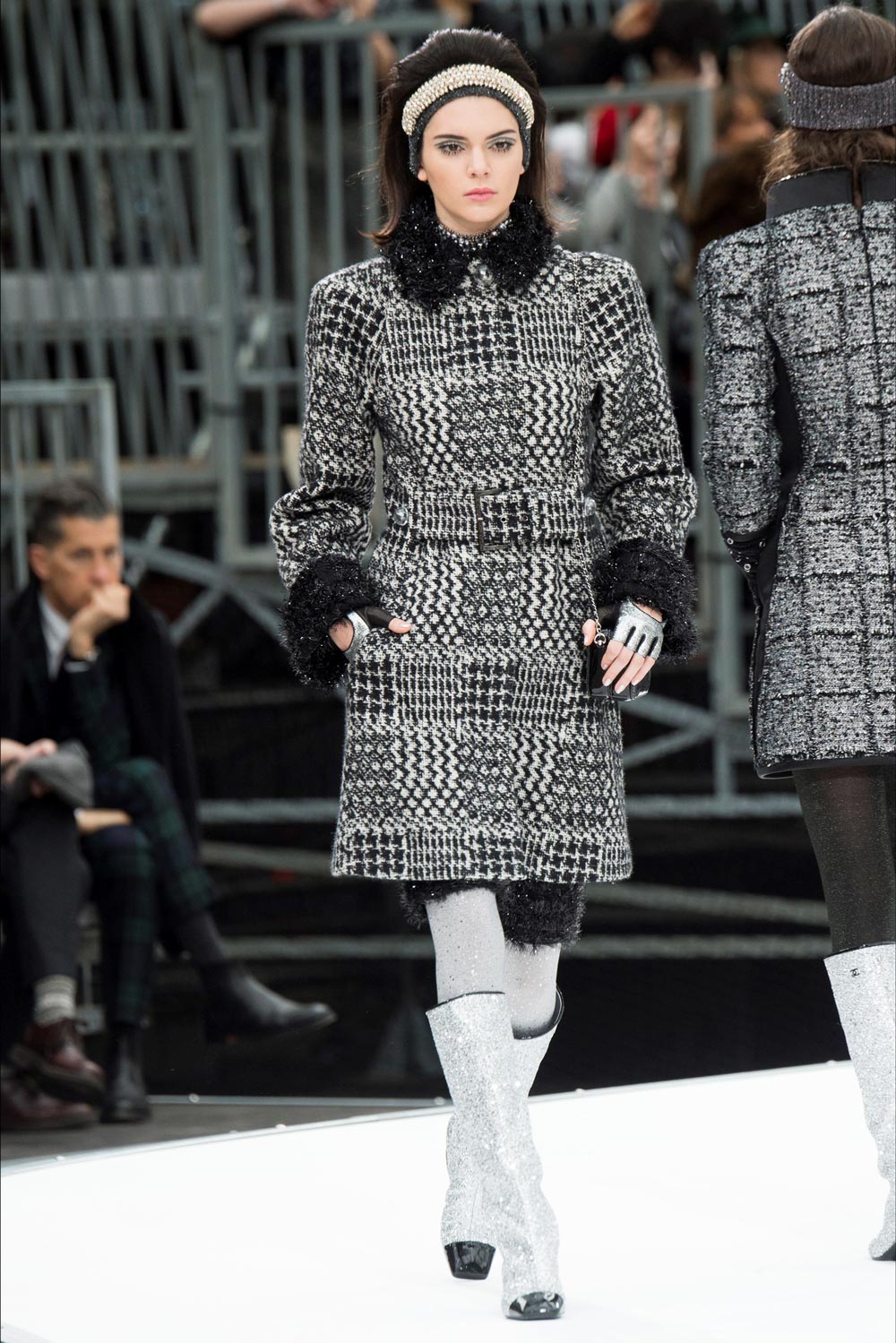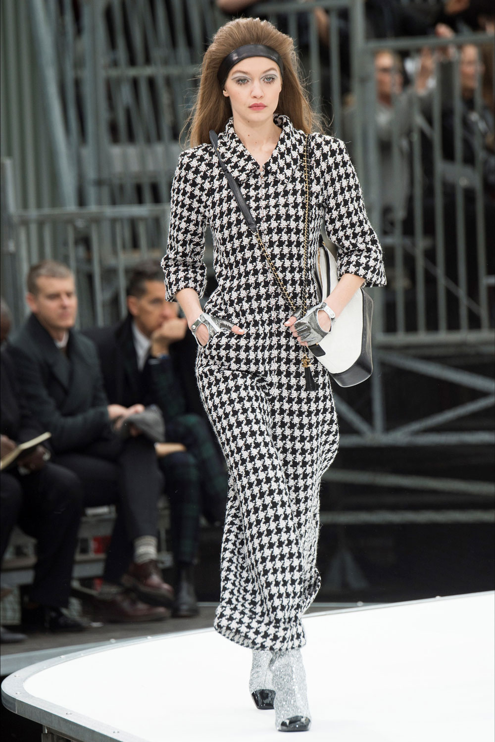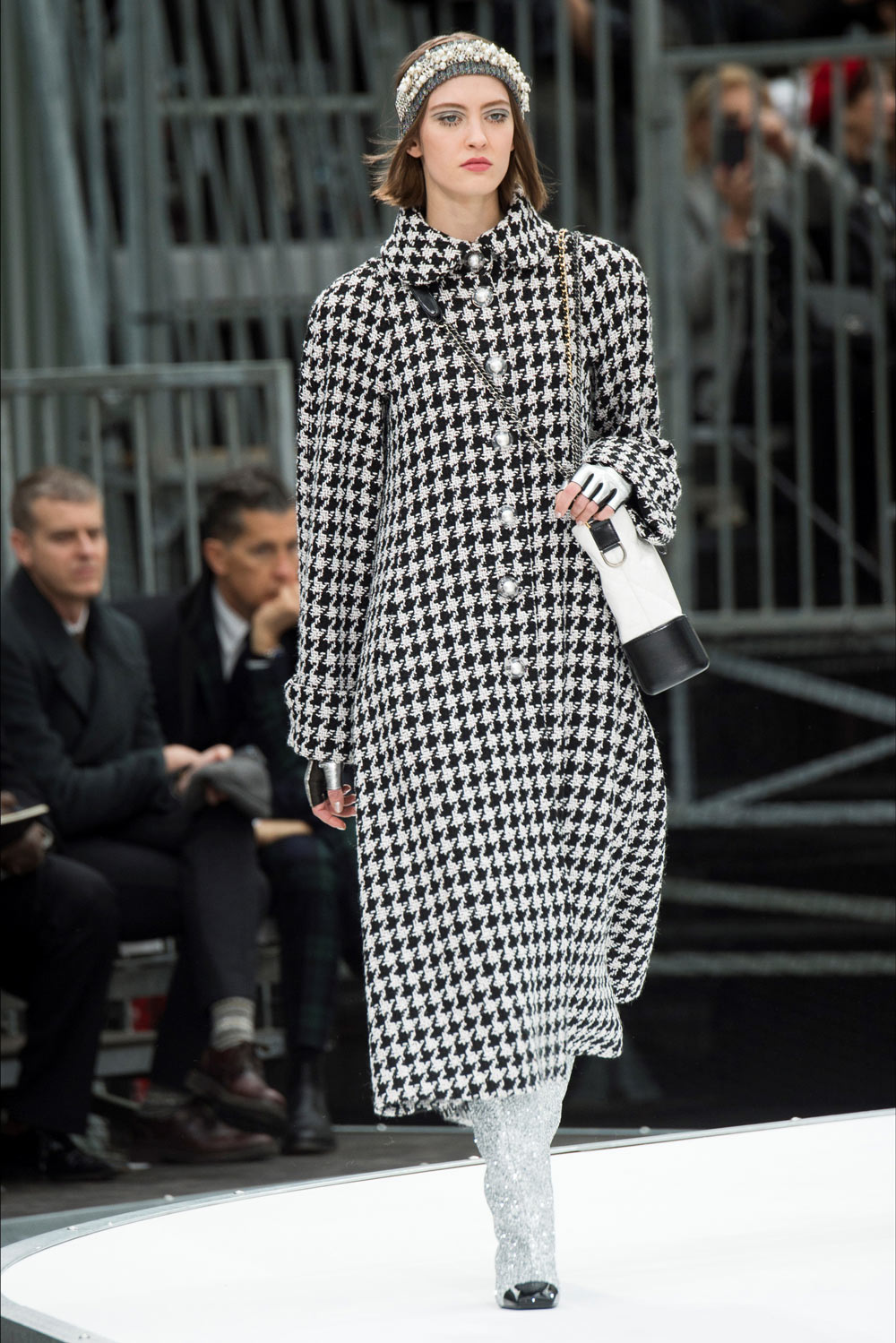 模特头戴绣有水晶和人造珍珠的发带,就如同银河。在配饰方面,2017春夏首发的Gabrielle手袋、饰有徽章图案的BOY CHANEL,以及闪光材质的超大号手袋接连登场。