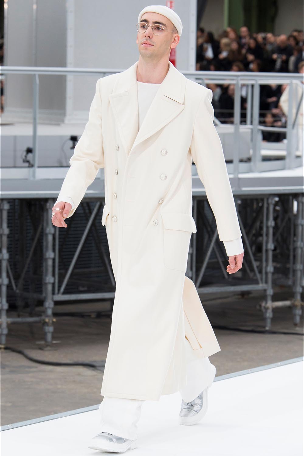 熟悉美国太空系列影片的观众很快在biubiubiu的秀场音乐里找到熟悉感。电子乐鼻祖Kraftwerk 1975年发行的《Radioactivity》散播在空间里,银光闪闪的模特从“冰屋”鱼贯而出。无论刺绣斜纹软呢外套或者裙装,无论是缎面或者双面绉稠,本季衣服的领口一律高挑、圆润且挺括,就好像宇航服。几款深蓝色上衣直接把宇航员用作印花。品牌经典斜纹软呢套装则采用巧妙的幻象设计,方肩衣袖仿佛叠加于背心上的独立配件。银色长款露指手套优雅地盖住手腕。