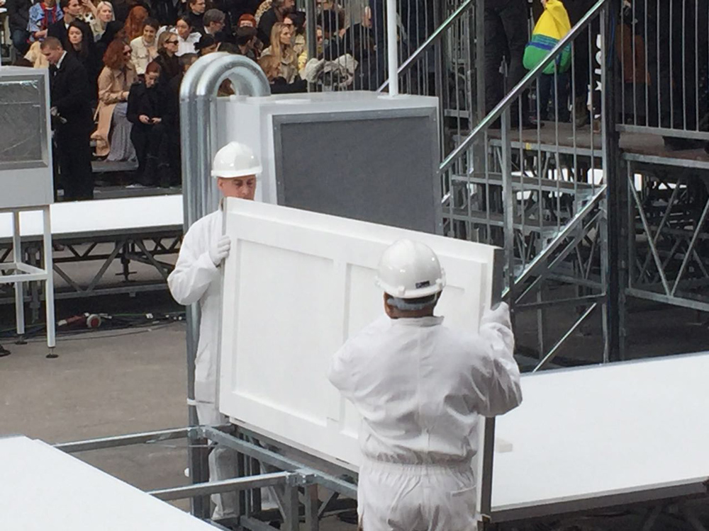 现场扮演技术员的工作人员套着白色连身工作服,头戴安全帽。T台两边的白色指示等一闪一灭,秀场一端有栋纯白的小“冰屋”,连接后台。