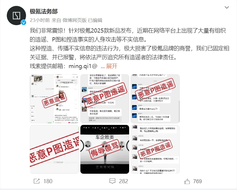 针对极氪2025款新品发布,近期在网络平台上出现了大量有组织的造谣、P图和捏造事实的人身攻击等不实信息。公司已固定相关证据、并已报警,将依法严厉追究所有造谣者的法律责任。