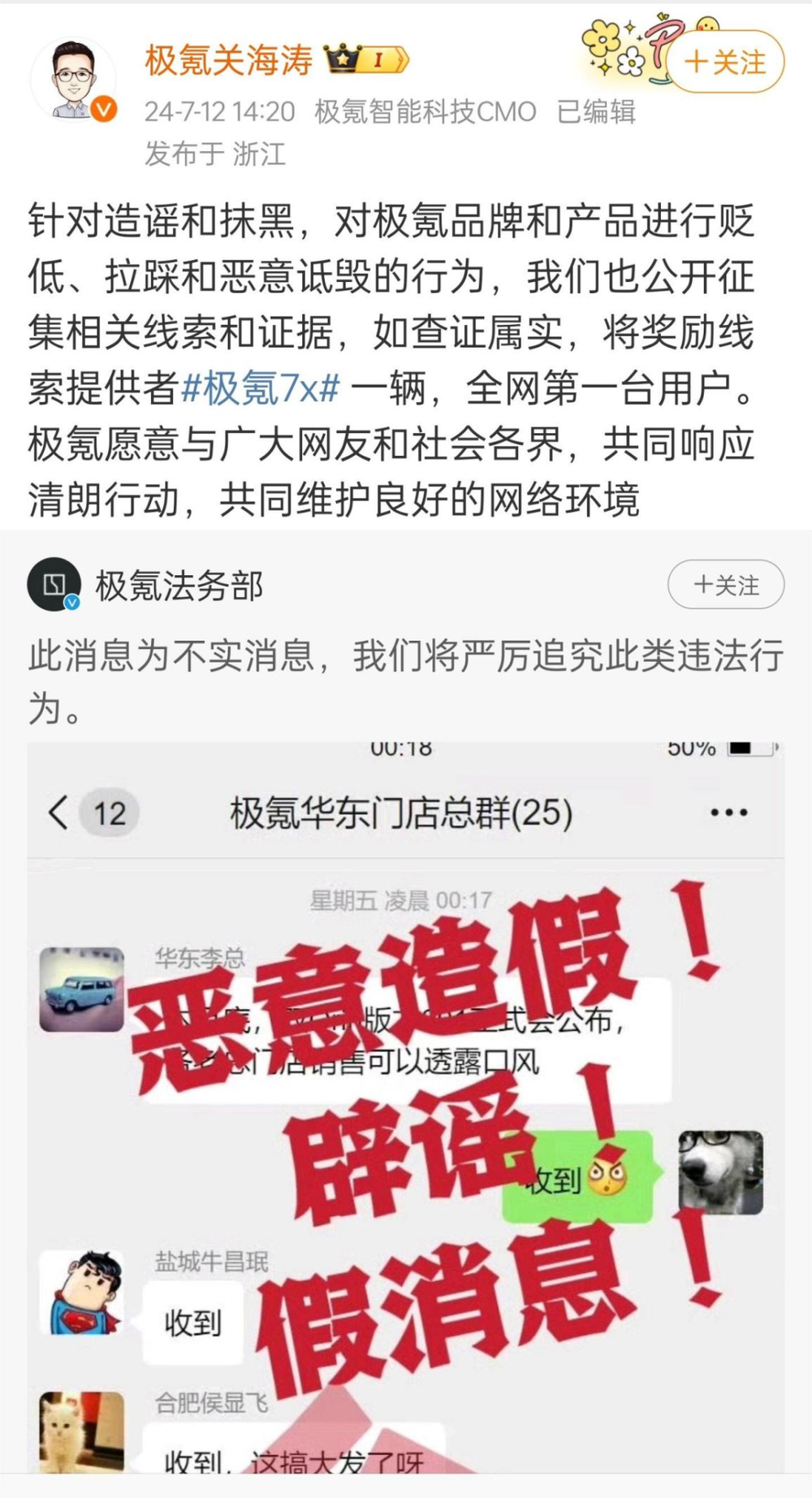 7月中旬,极氪法务部在微博出面辟谣「新版本 001 将于本月底正式公布」的消息,CMO关海涛还转发了该条微博,公开征集恶意诋毁、抹黑极氪品牌的相关线索和证据,还表示如查证属实,将奖励线索提供者极氪7x一辆。