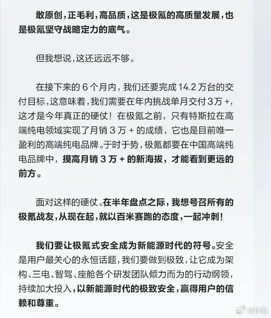 7月2日,在发布半年销量的第二天,安聪慧在极氪公众号发表长文《聪聪来信》: