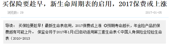 伴随着2017年1月1日,保险业第三套生命表《中国人身保险业经验生命表(2010-2013)》(下称第三套生命表)的启用,市场上出现不少利用新生命周期表“炒涨价”的保险营销文案。