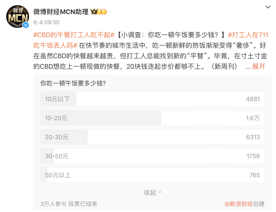 今年4月,新浪财经在微博发起了一项“午饭要花多少钱”的小调查,参与投票的3万人中,午餐花费30元以内的人群占比超过9成。