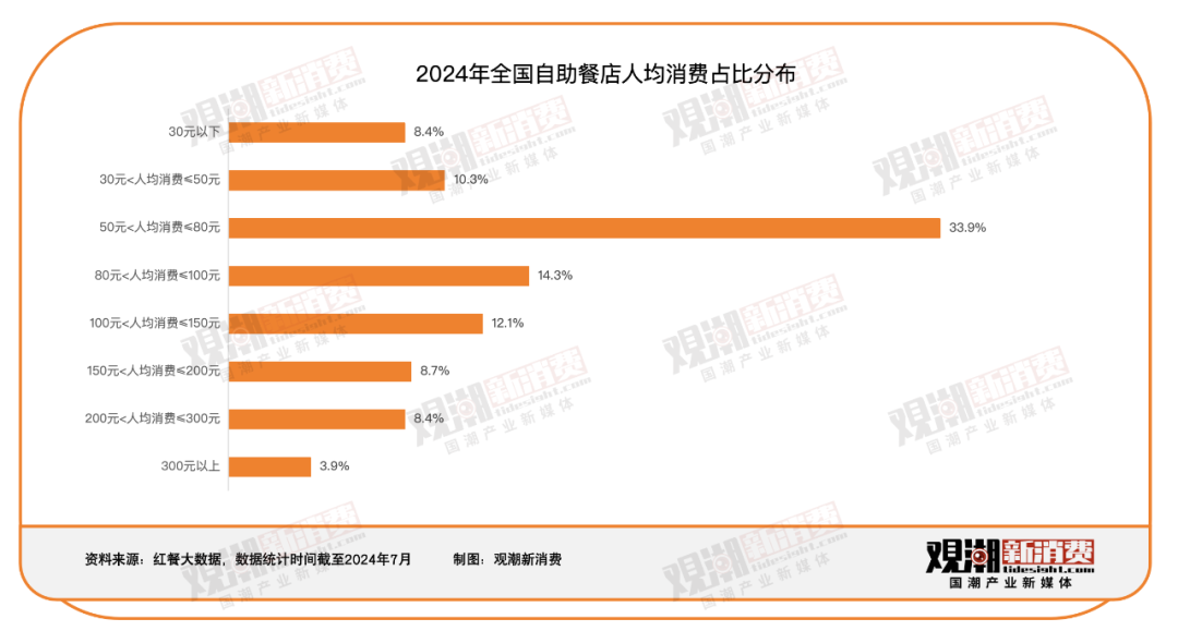 截至2024年7月,全国自助餐人均消费在80元及以下的门店数占比为52.6%,比2023年提高了1.9个百分点;人均消费在100元及以下的门店数占比为66.9%,比2023年提高了2.4个百分点。