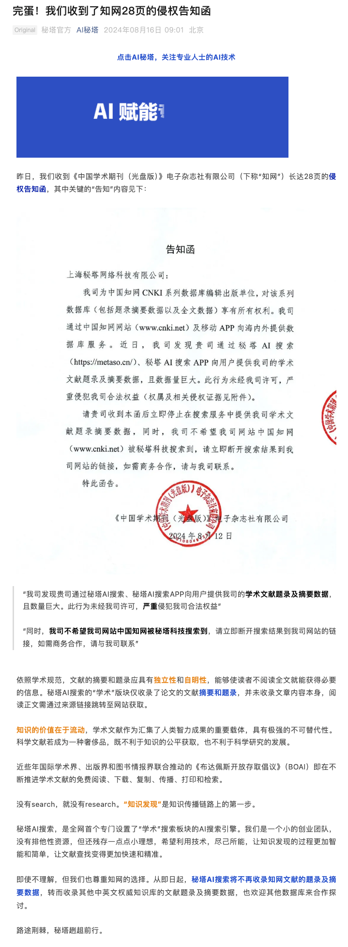 8月16日,上海秘塔网络科技有限公司官微发布声明称,昨日公司收到《中国学术期刊(光盘版)》电子杂志社有限公司(下称“知网”)长达28页的侵权告知函。秘塔科技在声明中表示,秘塔AI搜索的“学术”版块仅收录了论文的文献摘要和题录,并未收录文章内容本身,阅读正文需通过来源链接跳转至网站获取。秘塔科技称,即日起秘塔AI搜索将不再收录知网文献的题录及摘要数据。