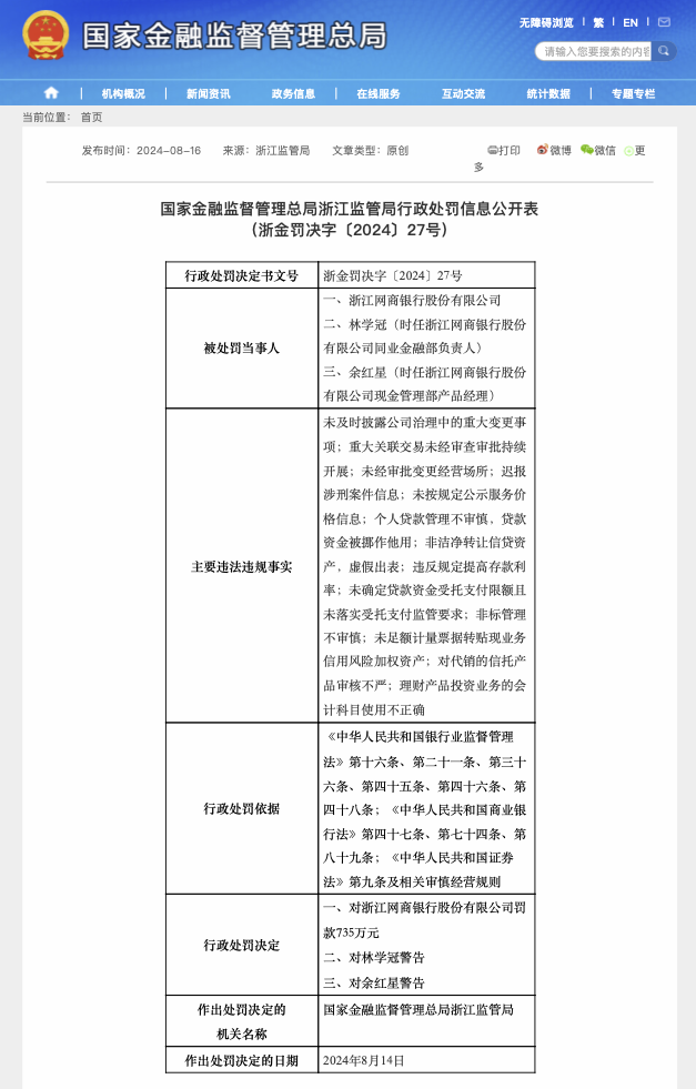 8月16日,国家金融监督管理总局浙江监管局行政处罚信息公开表显示,浙江网商银行股份有限公司被罚款735万元。主要违法违规事实包括:未及时披露公司治理中的重大变更事项;重大关联交易未经审查审批持续开展;未经审批变更经营场所;迟报涉刑案件信息;未按规定公示服务价格信息;个人贷款管理不审慎,贷款资金被挪作他用;非洁净转让信贷资产,虚假出表;违反规定提高存款利率;未确定贷款资金受托支付限额且未落实受托支付监管要求;非标管理不审慎;未足额计量票据转贴现业务信用风险加权资产;对代销的信托产品审核不严;理财产品投资业务的会计科目使用不正确。