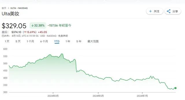 值得注意的是,尽管单季营收数据达27.3亿美元,但Ulta Beauty股价在2024年下跌了32%,跌至近年来的最低点,股票市盈率(P/E)低于两位数,其估值已经非常低廉。