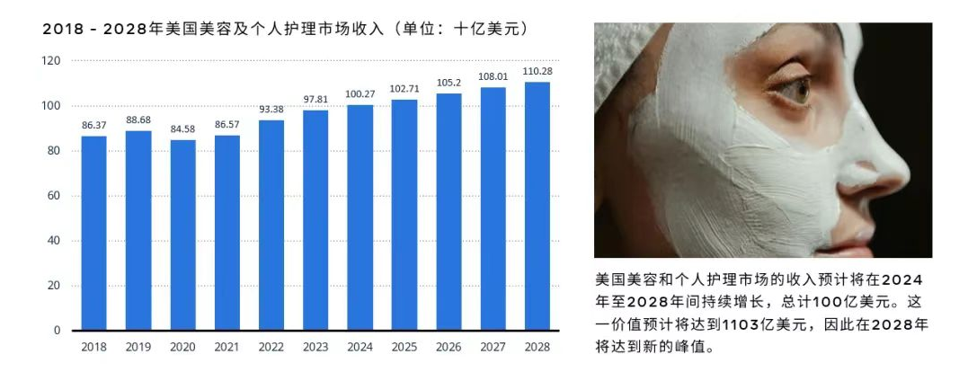 聚焦美国市场,其美容和个人护理领域的收入增长同样乐观,预计同期内将增加100亿美元,推动市场规模在2028年达到1103亿美元的历史高点。这一数据不仅凸显了美国美妆市场的巨大潜力,也体现了全球美容趋势的广泛影响。