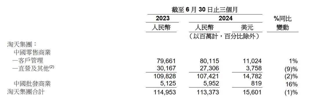 2024年第二季度,淘天集团收入为1133.7亿元,同比下降1%;京东零售收入为2570.7亿元,同比增长1.5%。其中,淘天集团零售部分的收入为1074.2亿元,同比下降2%,主要由于直营及其他收入下降9%;与此同时,客户管理收入同比增长1%。