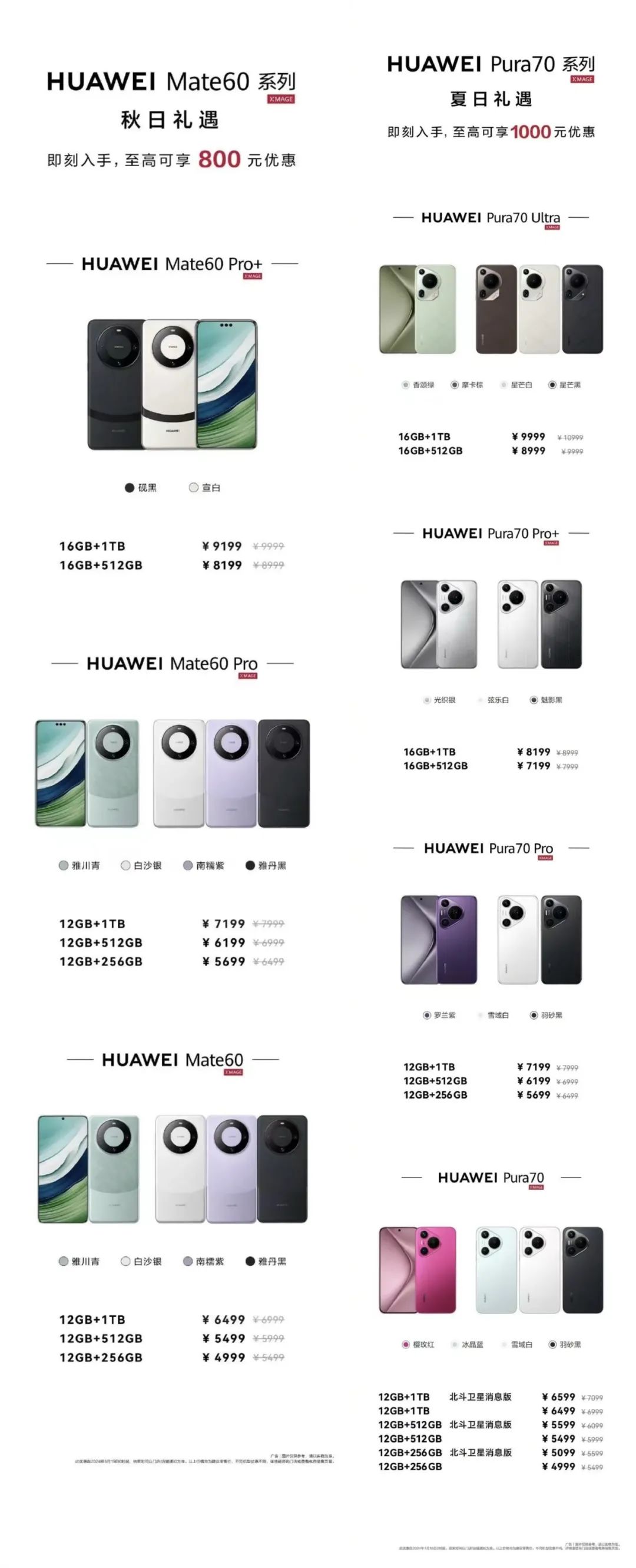 7月18日,华为Pura 70系列推出限时优惠,降幅最高达1000元。其中,华为Pura 70直降500元,售价4999元起;华为Pura 70北斗卫星消息版直降500元,售价5099元起;华为Pura 70 Pro直降800元,售价5699元起;华为Pura 70 Pro+直降800元,售价7199元起;华为Pura 70 Ultra直降1000元,到手价8999元起。