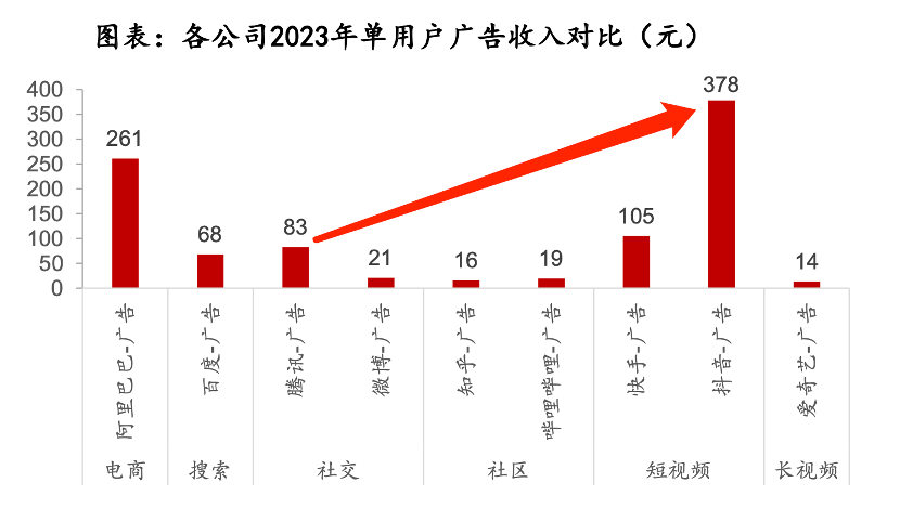 方正证券整理了我国代表互联网企业早2023年广告业务的ARPU情况,腾讯在该方面与抖音差距竟然高达4倍以上,与百度广告大概在同一水平。