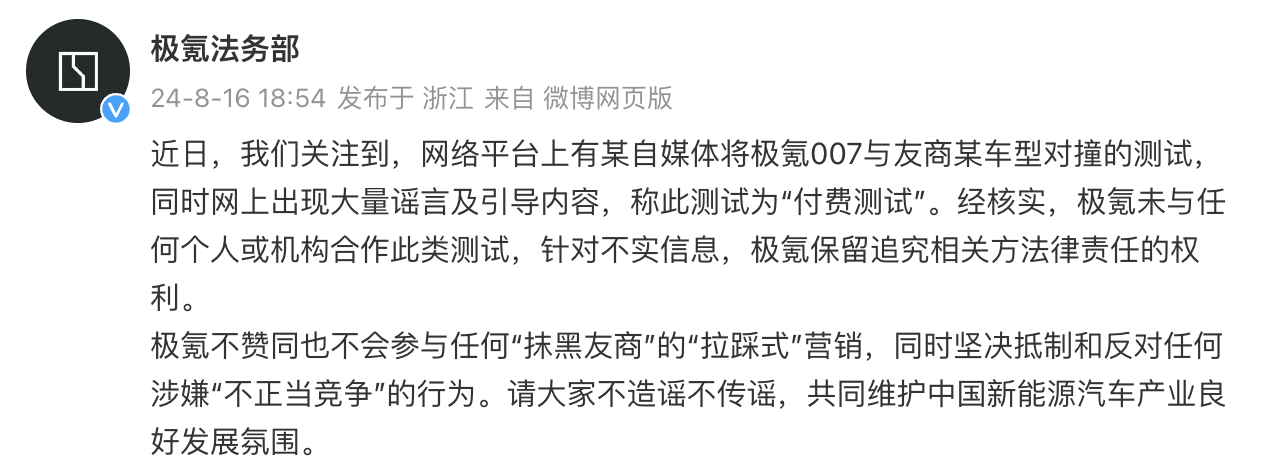 @极氪法务部 微博消息,近日,网络平台上有某自媒体将极氪007与友商某车型对撞的测试,同时网上出现大量谣言及引导内容,称此测试为“付费测试”。经核实,极氪未与任何个人或机构合作此类测试,针对不实信息,极氪保留追究相关方法律责任的权利。极氪不赞同也不会参与任何“抹黑友商”的“拉踩式”营销,同时坚决抵制和反对任何涉嫌“不正当竞争”的行为。