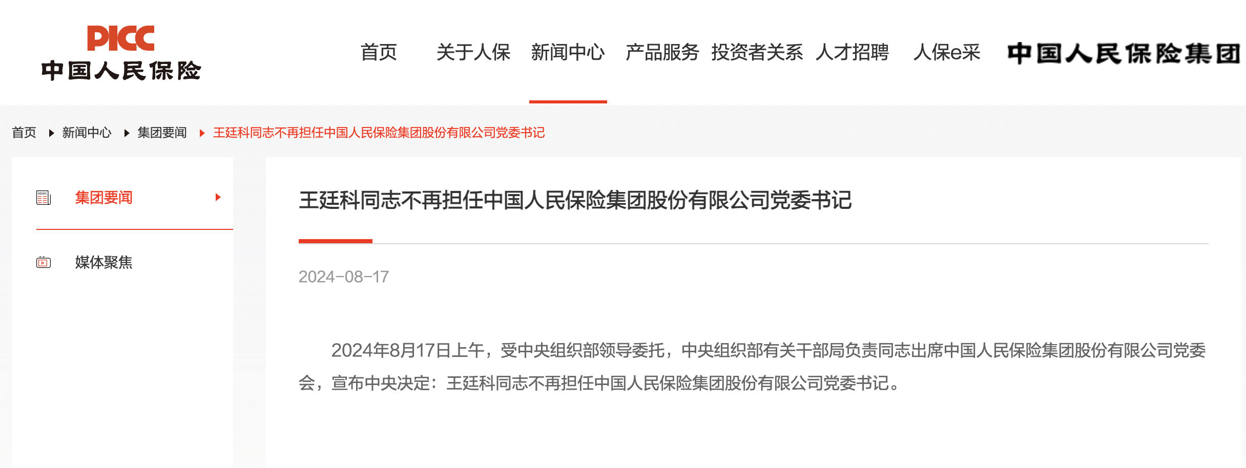 据中国人民保险集团官网消息,2024年8月17日上午,受中央组织部领导委托,中央组织部有关干部局负责同志出席中国人民保险集团股份有限公司党委会,宣布中央决定:王廷科同志不再担任中国人民保险集团股份有限公司党委书记。
