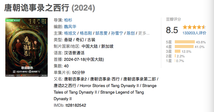 爱奇艺站内热度最高热度达10205,豆瓣开分8.1一路上涨到收官时的8.5分,《唐诡2》在今夏收获了热度口碑双爆的好成绩,该系列第三部也火速官宣。