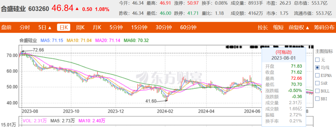 首先是股价情况,如今40多元的股价,相比2021年最高点的257.41元,已经跌去210元/股。仅从近1年的股价表现看,去年8月初,合盛硅业股价也曾达到71.62元/股,一年跌幅达到约35%。